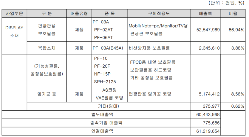 당사의 제품 유형별 매출구조를 보면 디스플레이 관련 필름 소재 분야가 전체 매출의 90.82%, 기능성 필름 및 임가공 등이 8.56%를 차지하고 있습니다. 기타 임대 소득으로 8.56%의 매출 비중을 차지하고 있습니다.