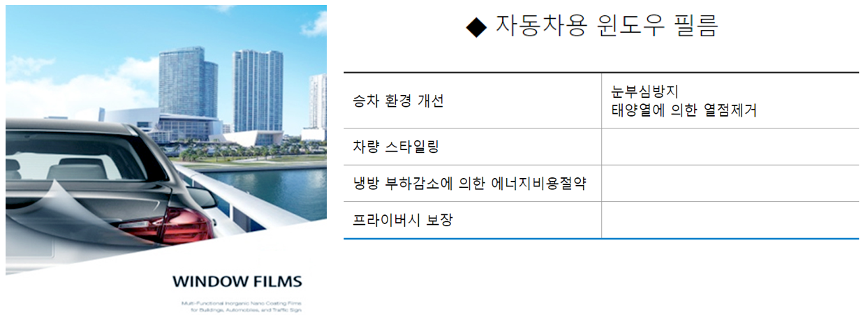 IR film은 윈도우에 부착하여 사용하는 필름으로 무기졸을 사용하여 변색이 없고 가시광선 영역의 투과율을 극대화하고, 적외선과 자외선을 효과적으로 차단해주는 필름입니다. 건축용과 차량용 윈도우 등에 널리 사용됩니다.