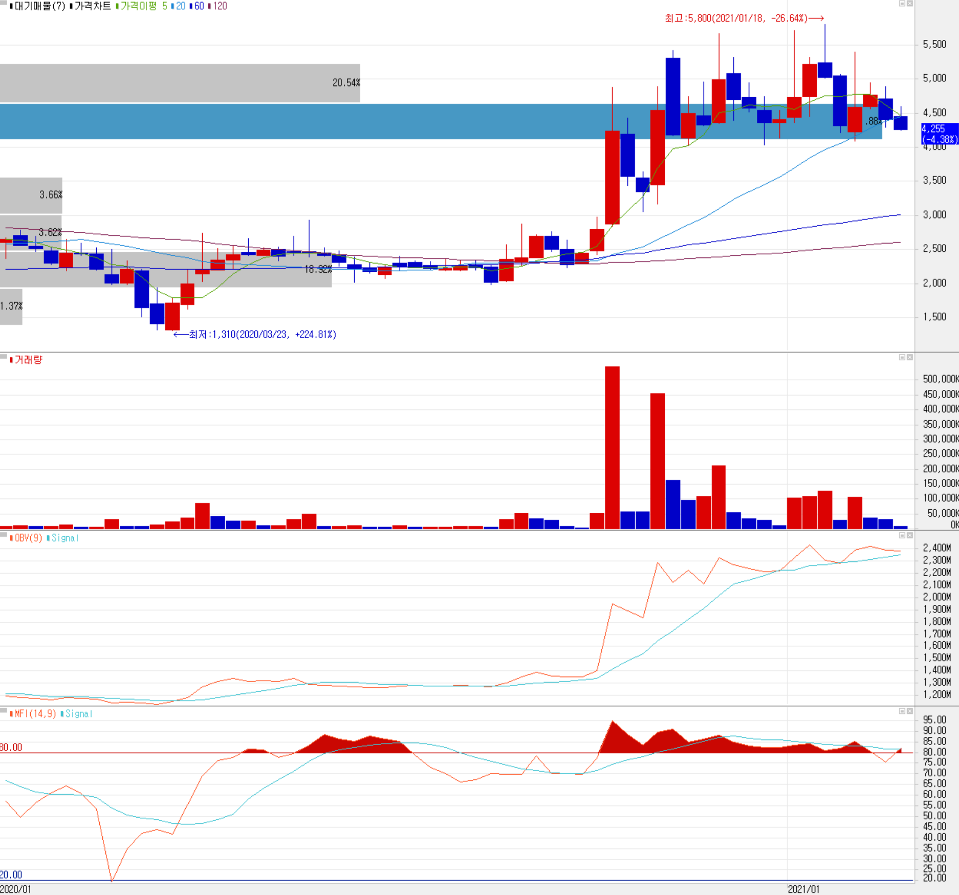 수급에서는 최근 기관의 움직임은 거의 없는 상황에서 개인과 외국인의 손바뀜이 잦은 편입니다. 지난 11월부터는 필름 사업의 안정적인 성장 가운데 자회사의 의료용 마리화나 연구에 대한 테마성 상승과 하락이 반복되면서 4,000~5,500원 사이 박스권을 형성하고 있는 모습입니다. 수급이 좋지 않은 상황이라 단기적으로는 하락 시 4,000원 선을 지지하는지가 중요할 듯하고, 상승 시에는 4,800원 근처에 저항이 있을 것 같습니다.