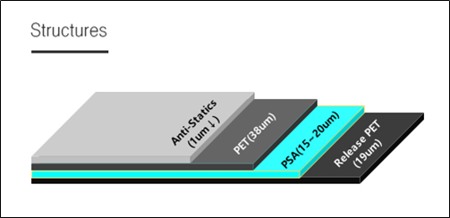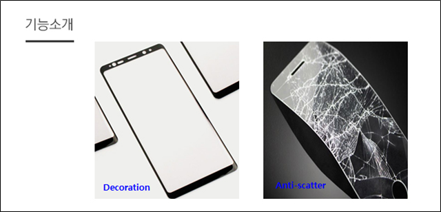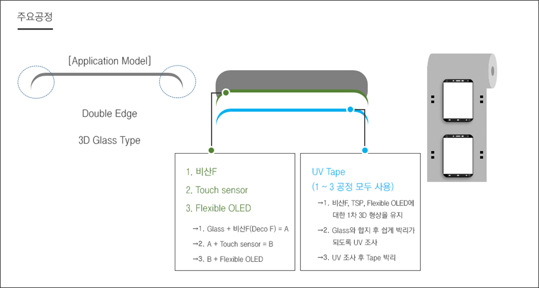 3D 및 4D Glass와 DECO 필름 Lamination 시 가이드 기능을 하는 필름으로 Touch Screen Panel, Flexible OLED에 대한 1처 3D 형상을 유지하고, Glass와 붙인 후 쉽게 박리되도록 UV 조사를 진행하여 제조됩니다.