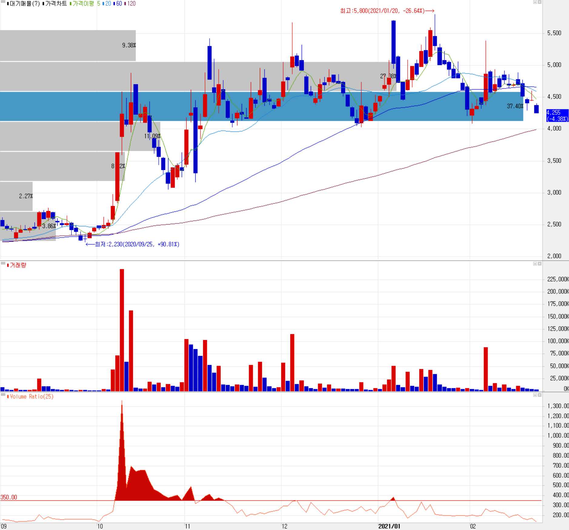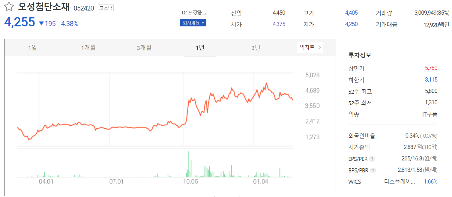 최근 시장 전반적으로 조정을 받으면서 당사의 주가도 영향을 받고 있습니다. 2월 23일 장 종료 기준 4,255원에 거래를 마쳤습니다. 외국인 비중은 0.34%이며, 시가총액 2,887억 원으로 코스닥 시총 상위 310위 종목입니다.