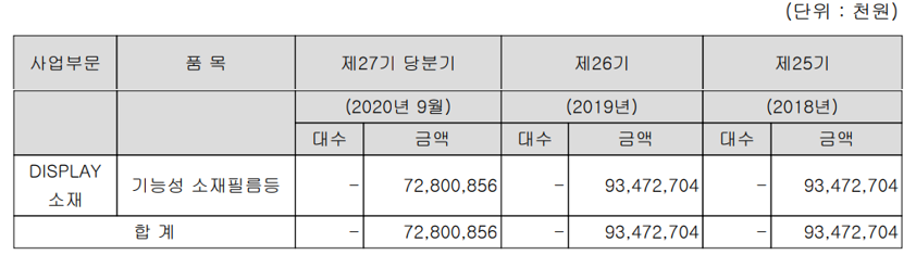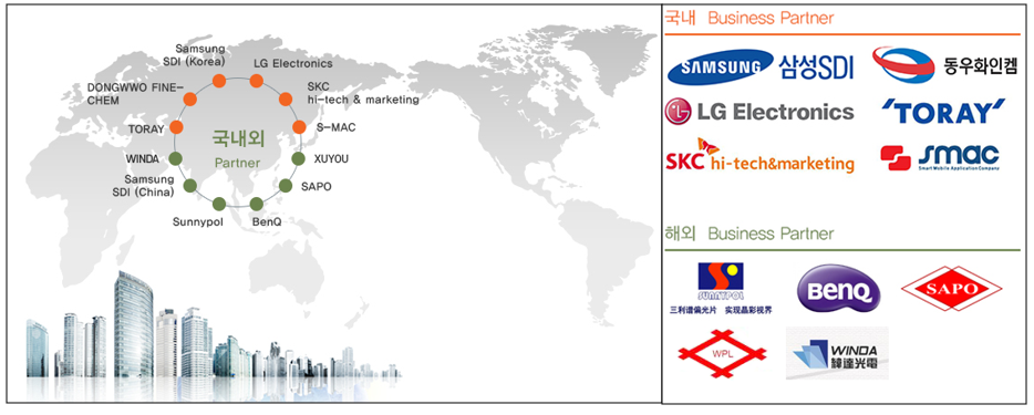 당사는 삼성SDI, LG전자 등 국내외 주요 디스플레이 및 전자기기 제조사들을 고객사로 확보하고 있으며, 고객사 주문량 증가에 따른 안정적인 납기를 위해 지난 2020년 새로운 라인 설비 증설을 완료한 상태입니다.