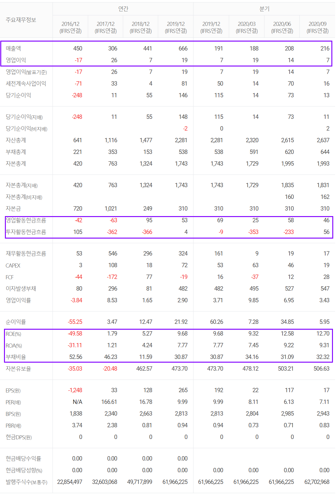 감사가 끝나고 2020년 최종보고서가 나오면 알겠지만, 오성첨단소재는 지난 2017년부터 매출액도 꾸준히 상승 중이고 특히 이익률이 획기적으로 좋아지면서 전반적인 현금흐름 등도 양호한 흐름을 보이고 있습니다. 부채비율 30%대를 유지함과 동시에 2020년 3분기 말 기준 현금성 자산이 368억 원을 보유하며 안정적인 재무구조를 가지고 있고, ROE, ROA, EPS 등의 흐름도 양호한 흐름을 유지하고 있습니다.