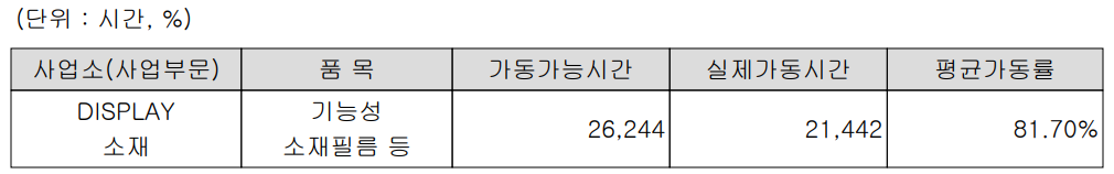 당사의 주력 사업인 소재 필름의 가동률을 설비의 가동 가능시간으로 환산 시 81.70%의 가동률을 기록했습니다.