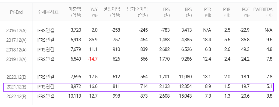 2020년 컨센서는 잠정실적 대비 오차가 있습니다. 아무튼 2021년 컨센서스 기준 당사의 매출액은 8,972억 원을 예상하여 전년 동기 대비 24.4% 증가하고, 영업이익은 811억 원으로 138.5% 증가할 것으로 추정했습니다.