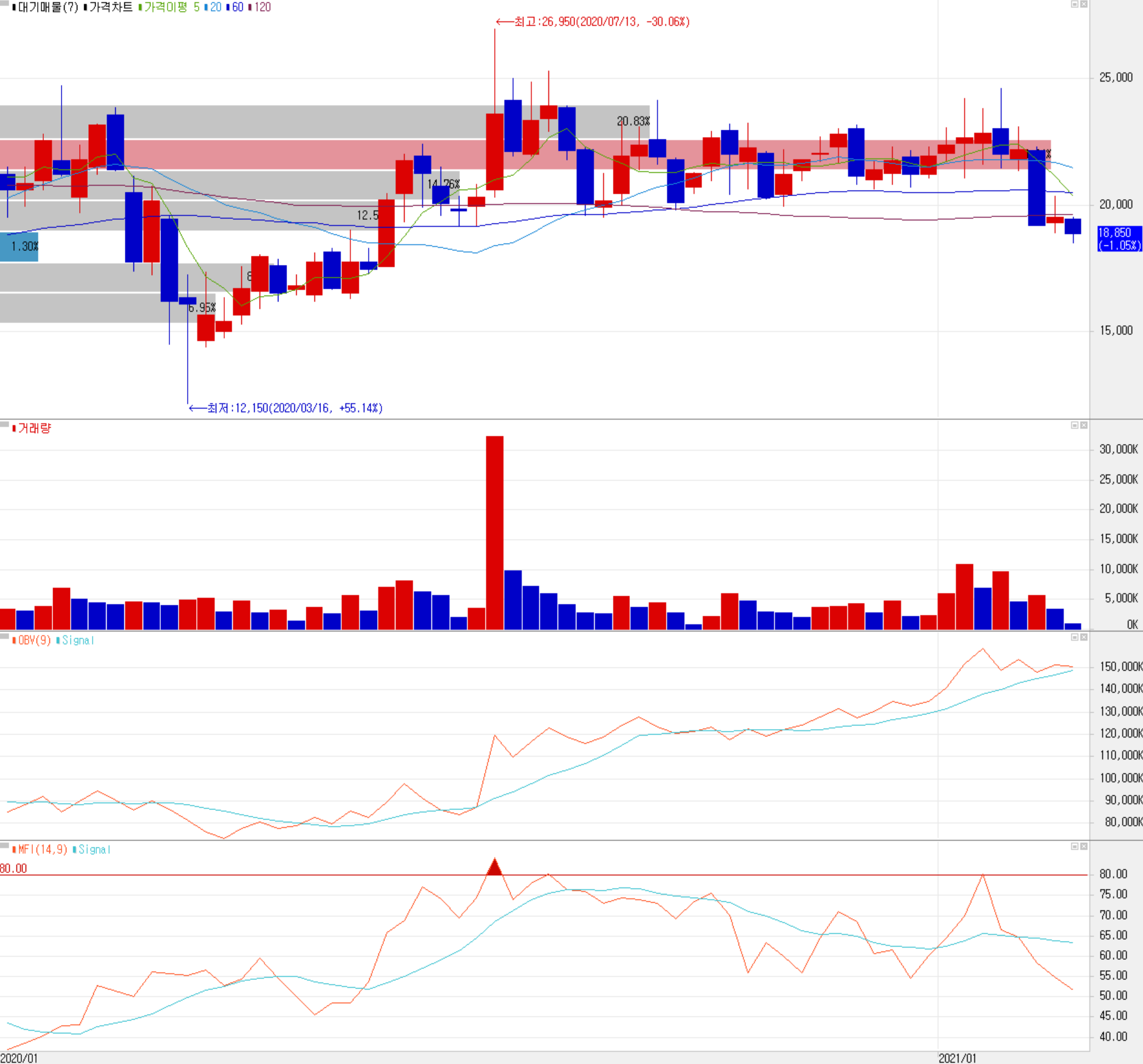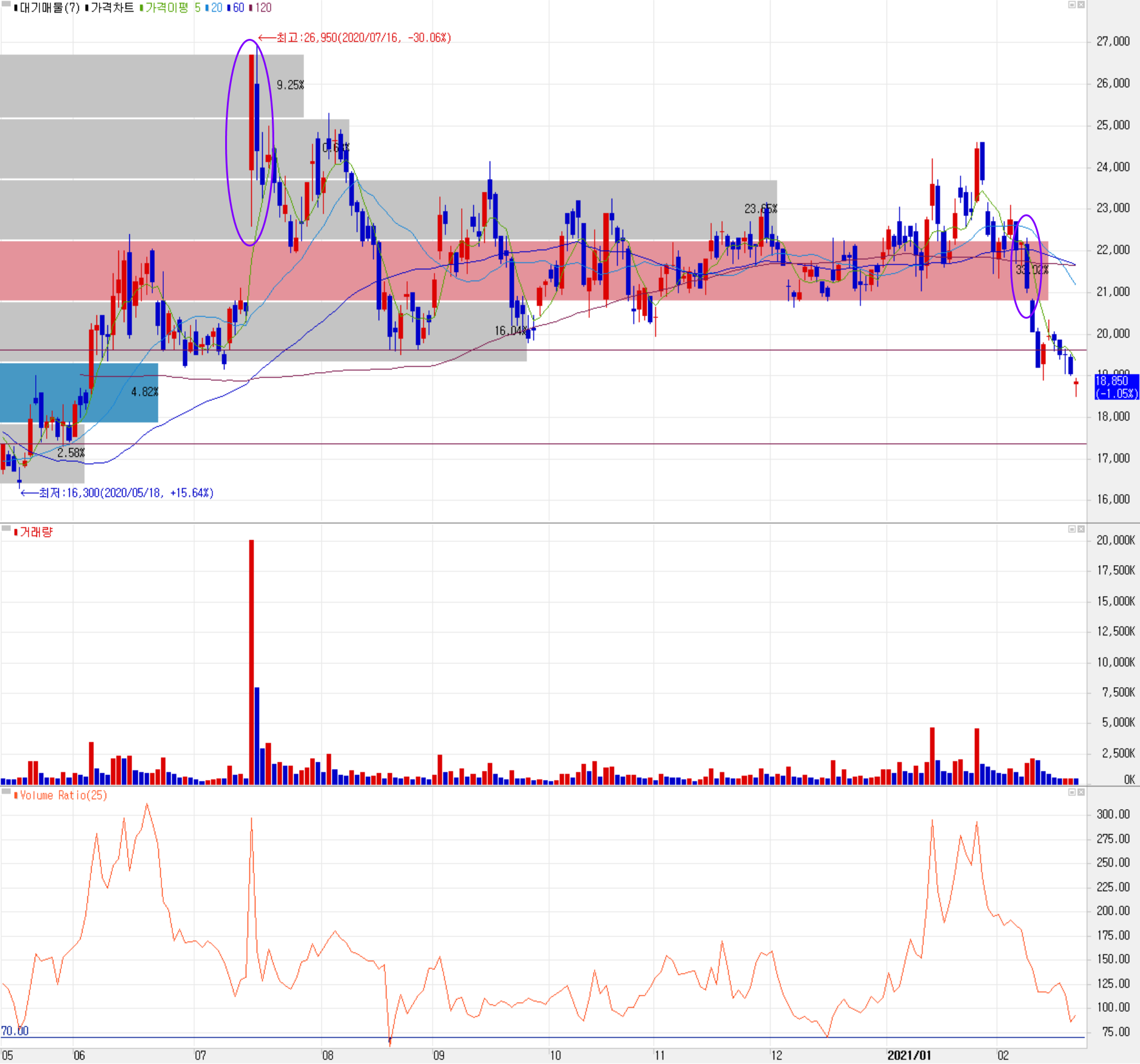 지난해 7월 14일 자회사인 디케이티와 공동 개발한 5G 안테나 케이블이 퀄컴의 사용 승인을 받으면서 하루아침에 주가의 레벨이 달라졌으나, 대부분 되돌리면서 이후 오랜 기간 20,000~24,000 원 사이 박스권을 형성했습니다. 최근에 2월 8일 자로 2020년 잠정 실적이 공개되면서 현재 20,000원 선도 무너진 상황입니다.