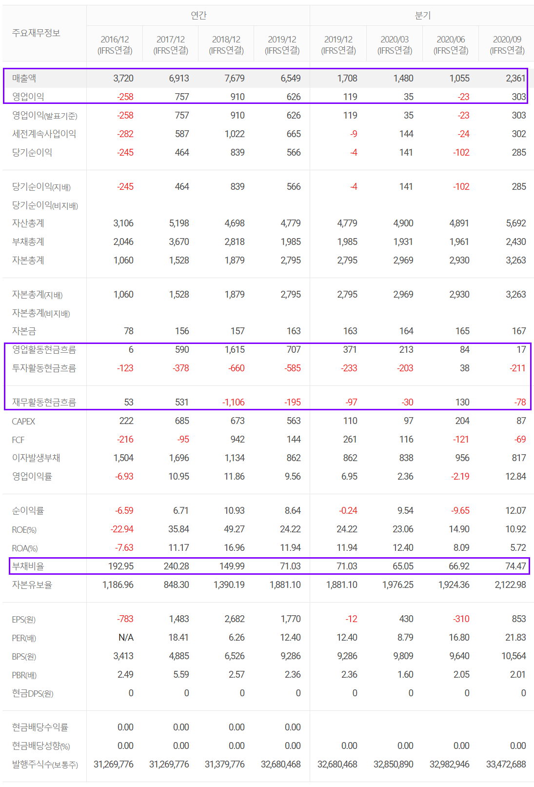 연매출은 2017년 부터 약 7,000억 원대를 유지하고 있으며, 창출된 현금으로 신규 설비의 증설 및 연구 개발에 대한 투자를 하고 있습니다. 부채비율도 2019년부터 양호한 모습을 보이고 있고, 현금성 자산도 2020년 3분기 말 현재 650억 원을 보유하여 안정적인 재무상태를 보이고 있습니다.
