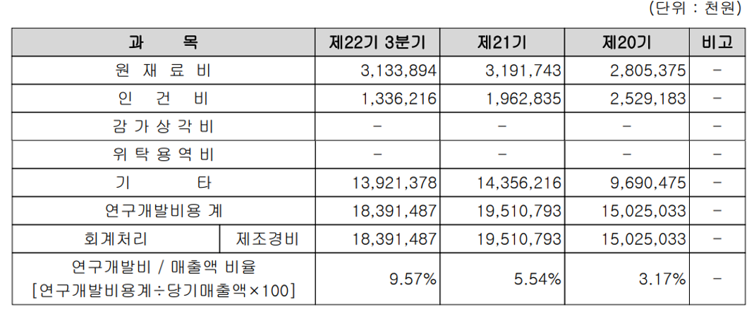 최근 3년간 당사의 연구 개발에 대한 비용은 증가 추세를 보이고 있으며 지난 2020년 3분기말 기준 전체 매출액의 9.57%를 사용하였습니다.