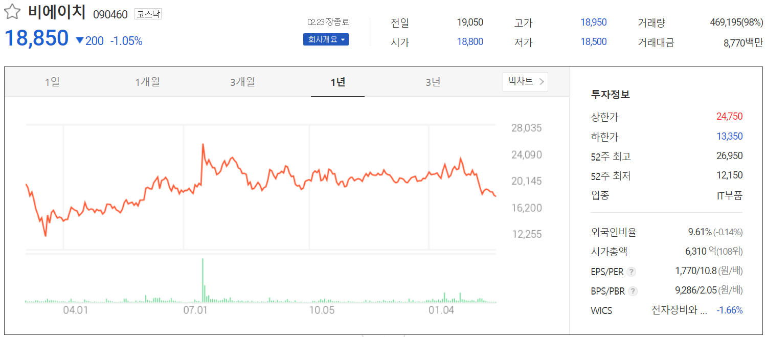 당사의 주가는 2월 23일 장 종료 기준 18,850원에 거래를 마쳤습니다. 외국인 비중은 9.61%이며, 시가총액 6,310억 원으로 코스닥 시총 상위 108위 종목입니다.