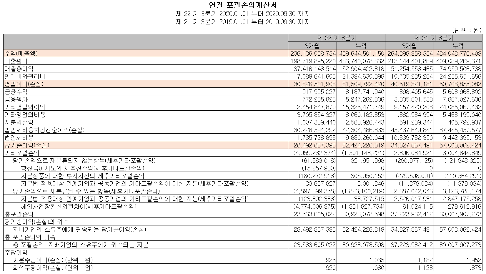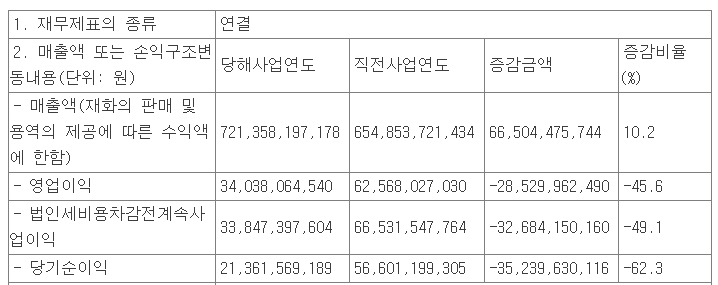 2020년 연 매출은 7,214억 원으로 전년 동기 대비 10.2% 증가하였으나, 영업이익은 340억 원으로 45.6% 감소, 당기순이익은 214억 원으로 62.3% 감소했습니다. 이익의 감소는 주로 코로나19의 영향으로 해외법인 생산성 저하 및 그로 인해 국내 생산 원가 상승, 스마트폰 중저가 모델 물량 증가로 인해 수익성이 감소한 것으로 밝혔습니다.