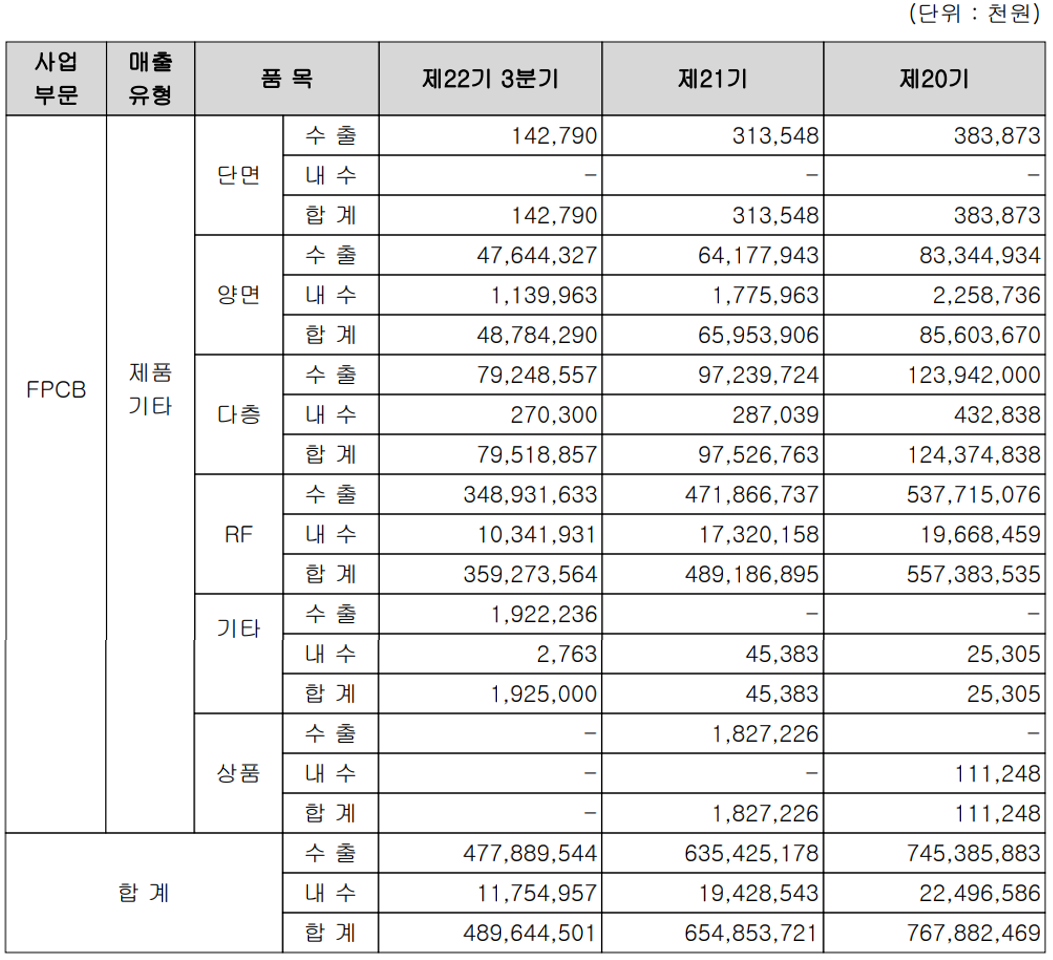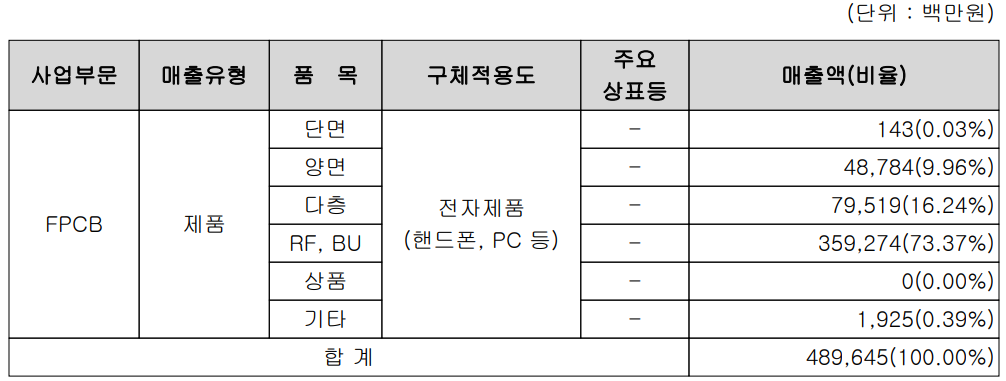 당사의 매출은 100% FPCB로 나오고 있으며, 그중에서도 RF(Rigid Flexible PCB)와 Build Up PCB 부문의 매출이 전체 매출의 73.37%를 차지하는 주력 제품입니다.