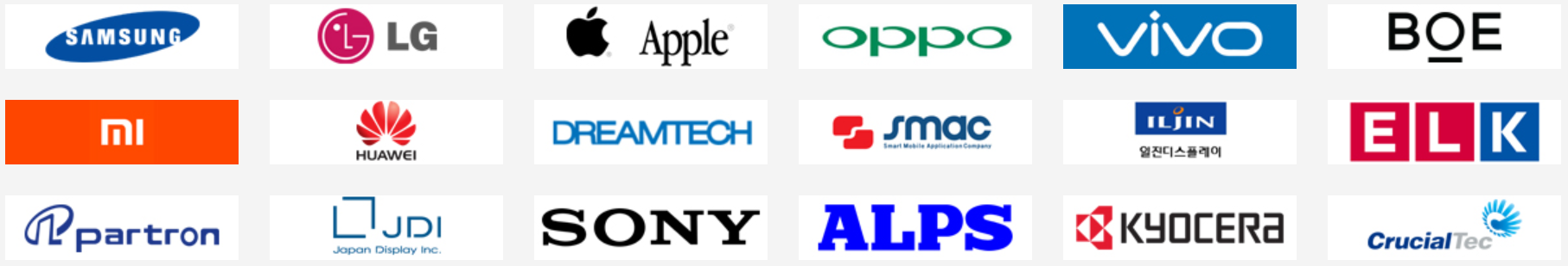 당사의 주요 고객사에는 삼성전자, LG전자를 비롯하여 미국의 애플사가 있으며, 중화권의 oppo, ViVo, BOE 등 해외 유수의 스마트폰 및 전자기기 제조업체를 고객사로 확보하고 있습니다.