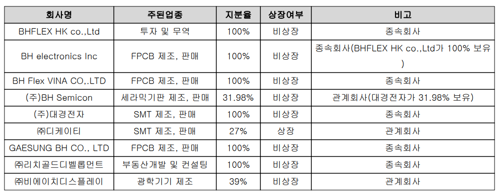 해외 현지 법인으로는 중국(BH Electronics)과 베트남(BH Flex VINA)이 있으며, SMT 제조 및 판매를 목적으로 설립된 대경전자와 관계사인 디케이티 등이 있습니다. 최근에는 (주)디케이티와 5G 안테나 케이블의 공동 연구개발에 성공하여, 글로벌 모바일 통신업체인 퀄컴의 사용 승인을 받으면서 사업 다각화를 추진하고 있습니다.