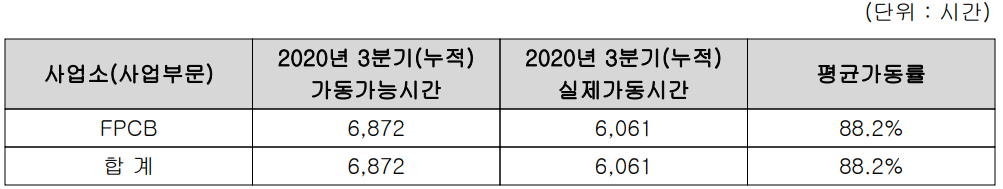 연성회로기판의 가동 시간 기반의 가동률은 88.2%로 코로나19의 영향 없이 꾸준한 생산 실적을 보여주는 것 같습니다. 설비 투자에 있어서도 2020년에 이어 2021년에도 약 100억 원 규모의 신규 증설을 예상하고 있습니다.