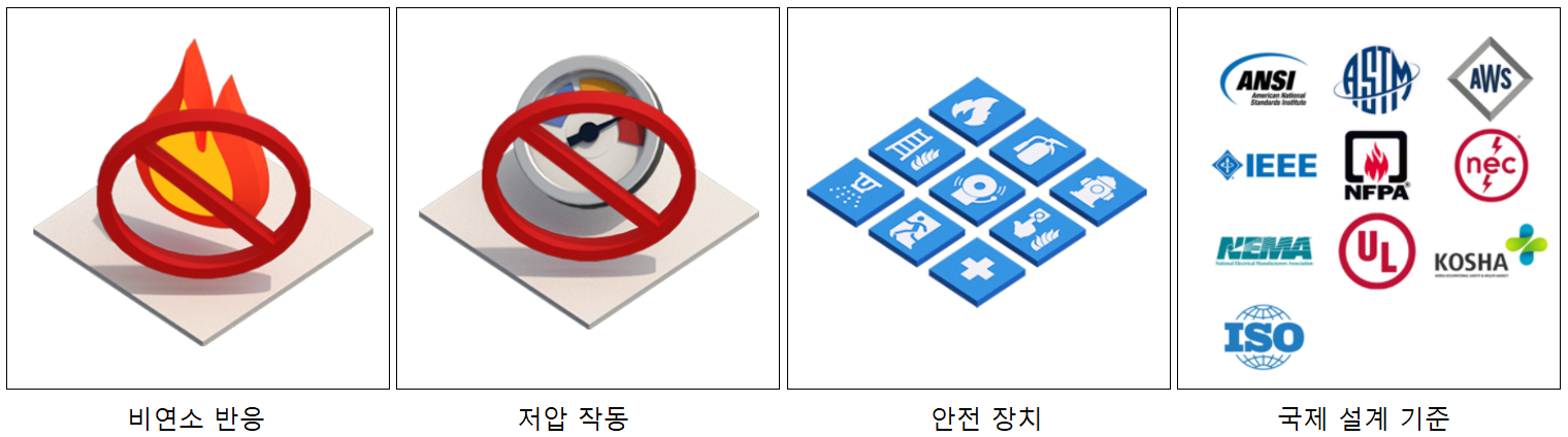 수소연료전지는 수소와 산소의 전기화학반응을 통해 발전하는 비연소식이기 때문에 화재의 위험성이 없고, 전 과정에서 상압 상태로 연료 공급 및 처리가 이루어지며, 저장되는 연료가 없어 폭발 위험성이 없습니다.