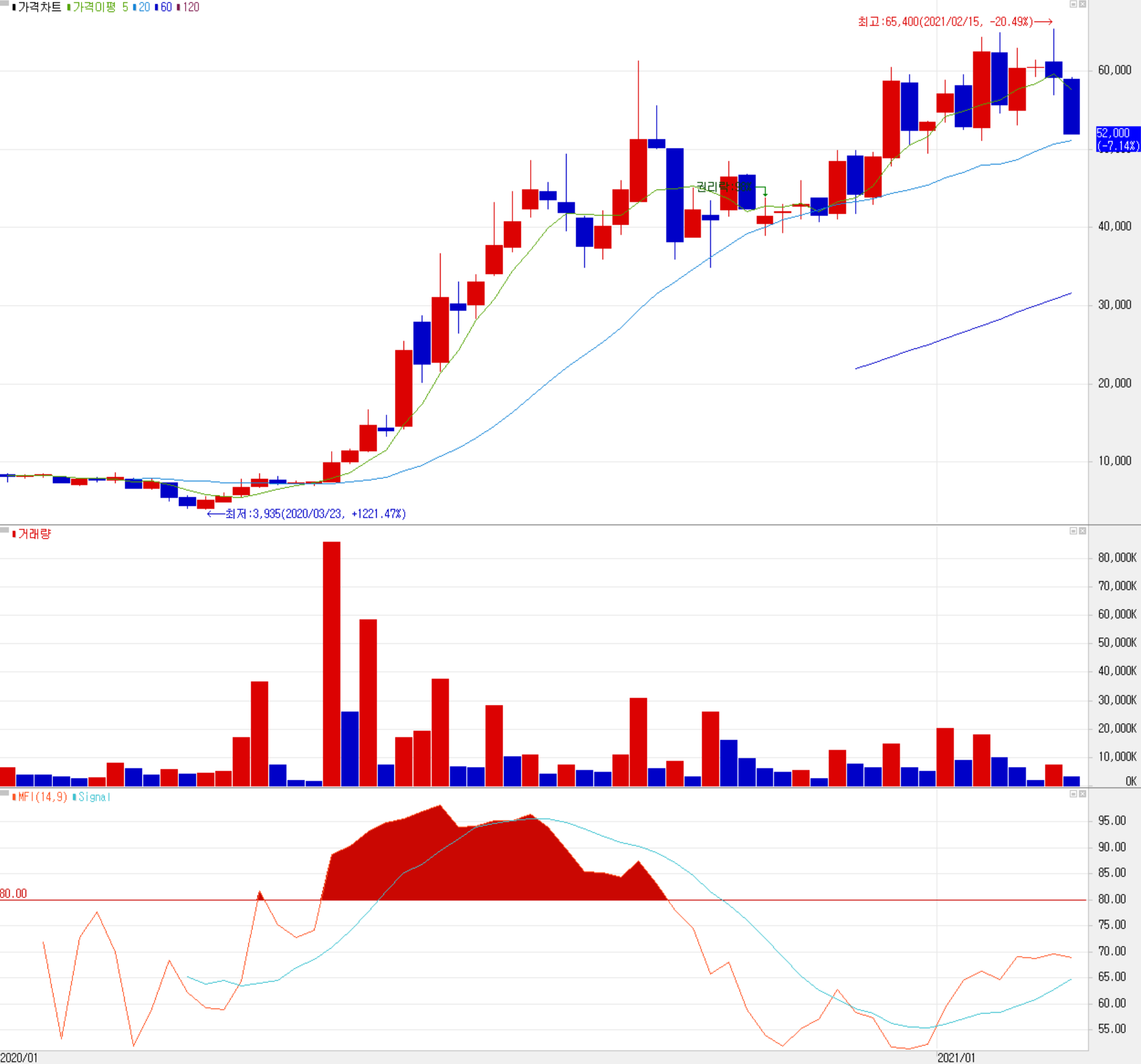 지난 1월까지는 하락 시에도 저점을 높이면서 반등을 했으나, 오늘 전저점이 깨진 채 마감했습니다. 금리가 상승하면 대형 투자자들은 위험성 높은 유가증권의 포트폴리오를 줄일 수 있기 때문에 당분간 기관의 수급 추이도 주요 관심사입니다. 단기적으로 49,000원을 1차 지지로 보고 당분간 보수적인 대응이 필요한 시기 같습니다.