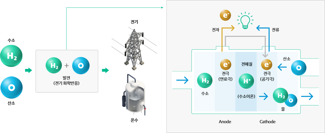 수소 연료전지의 동작 원리는 수소(H2)가 연료극(ANODE)으로 투입되면 촉매에 의해 수소양이온과수소 양이온과 전자로 분리됩니다. 전해질은 이온만 통과시키는 물질로 수소 이온은 연료극에서 전해질을 통과하여 공기극으로 이동합니다. 전해질을 통과한 수소 양이온과 공기극으로 투입된 산소가 촉매에 의해 서로 결합하여 물이 생성됩니다. 수소 양이온을 멤브레인(MEA) 막을 통해 흘려보내면 산소와 만나 음극을 형성하면서 전기에너지와 열에너지가 발생하게 됩니다.