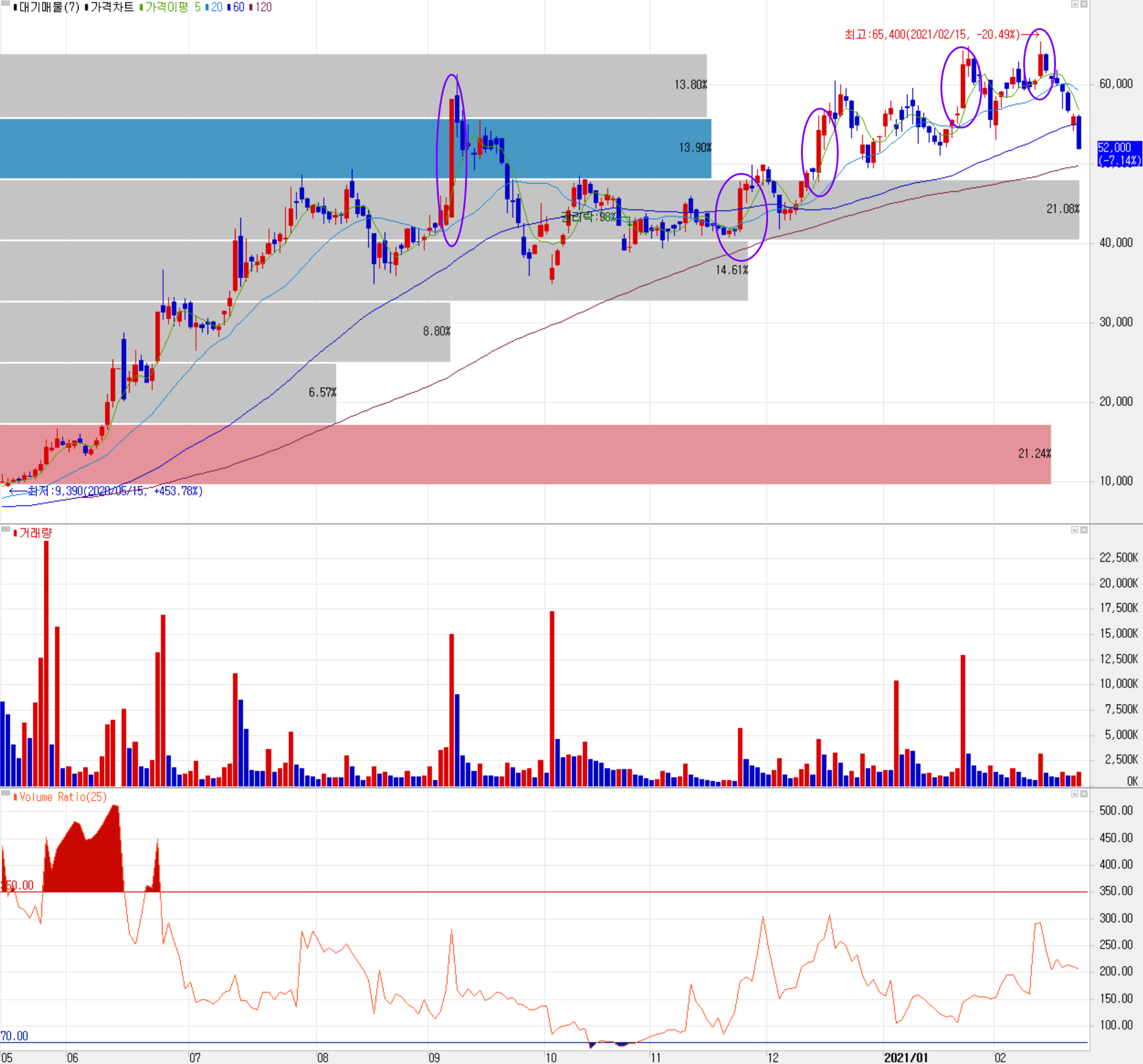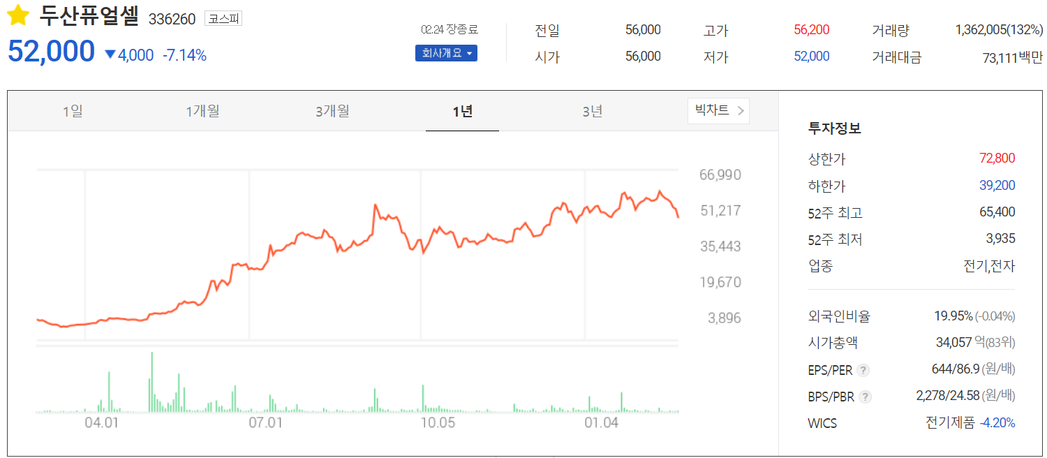 11월 25일 시장에 두산퓨얼셀이 KOSPI200 지수에 편입된다는 소식과 함께 거래량이 증가하면서 한동안 횡보하던 주가가 반등을 시도했다가 대부분 반납했으나 12월 9일 유상증자 성공, 12월 11일 KOSPI200 편입되면서 꾸준한 상승추세를 보입니다. 2021년 들어 1월 22일 세계 최대 자산운용사인 블랙록이 당사의 보유지분을 1.06% 늘린다는 소식에 주가가 급등하면서 사상 최고치인 65,400원(장중)까지 올라갔습니다.
