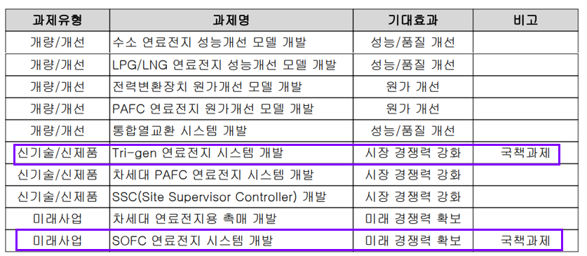 당사는 신규 사업으로 미래 성장 모델인 LPG 연료 사용 모델, Tri-gen 모델 및 SOFC 연료 전지 시스템의 연구 개발에 주력하고 있습니다. LPG 연료 사용 제품은 LNG와 LPG를 듀올로 사용할 수 있어 연료의 가격과 설치 지역의 연료 사용 환경에 따라 효율적인 발전이 가능한 제품으로서, 현재 실증을 완료하고 사업화를 추진 중에 있습니다.