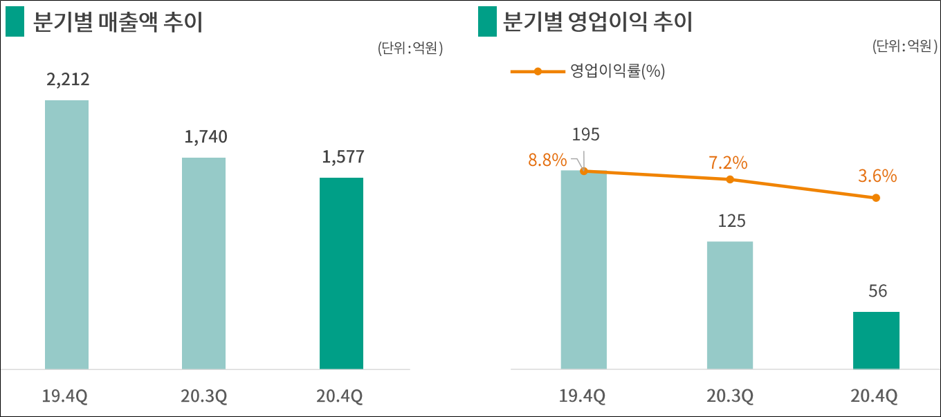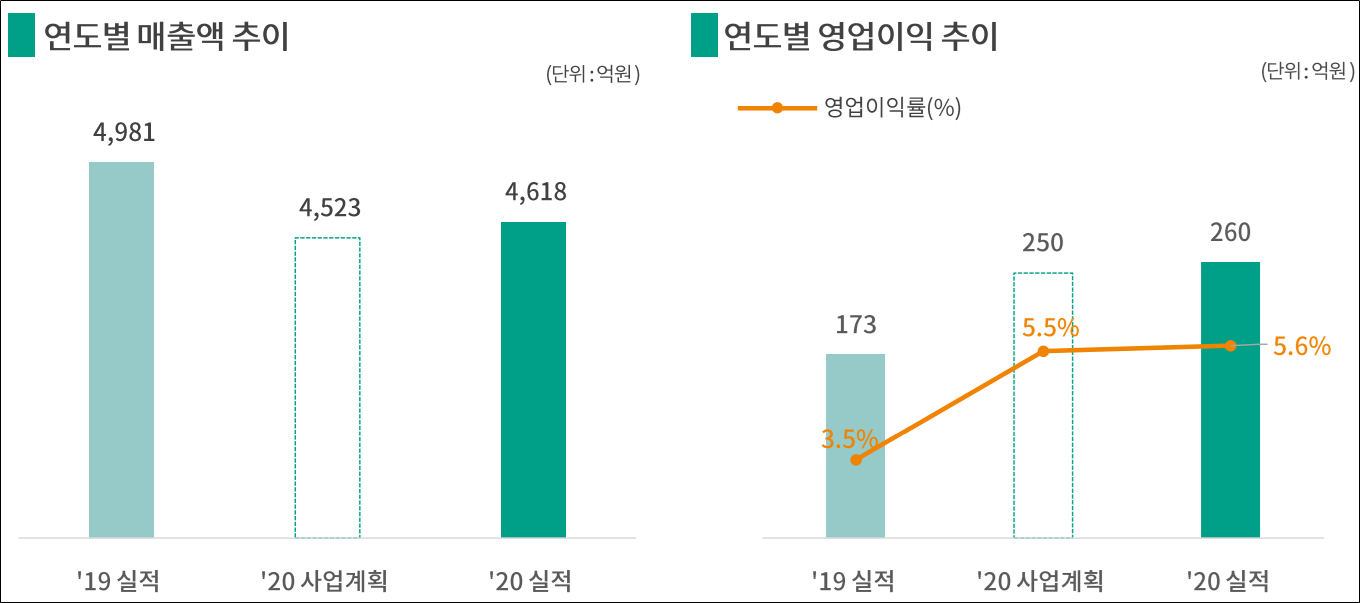 2020년 연매출액은 4,618억 원으로 전년 동기 대비 -7%, 영업이익은 260억 원으로 51% 증가했습니다. 당사에 의하면 매출액 감소 요인은 재고 매출에 대한 감소가 있었고, 연료전지 기기와 장기유지보수 서비스의 수익성이 개선되면서 영업이익이 대폭 개선되었습니다.