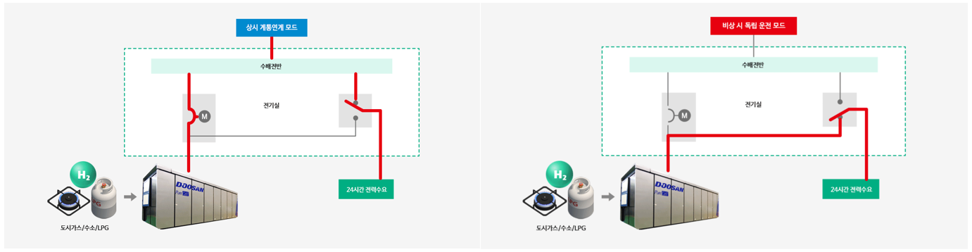 당사의 시스템은 자연 재해 또는 정전 발생 시 즉시 독립 운전 모드로 전환되어 안정적인 전력 및 열 공급이 가능합니다. 또한 수소연료전지 발전 시스템은 24시간 IoT 기반의 실시간 원격 감시 시스템을 통해 문제 발생 시 즉시 대응이 가능합니다.