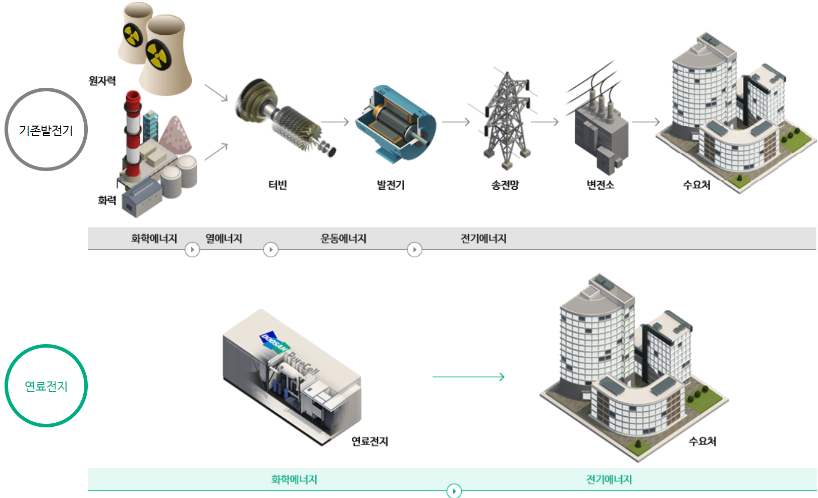 수소 연료전지는 발전 효율에 있어서도 가스 엔진이나 마이크로 터빈 방식보다 고효율의 전기에너지를 얻을 수 있고, 적은 설치면적과 다양한 설치 조건에 유연하게 대응할 수 있어서 초기 투자비용을 최소화할 수 있습니다.