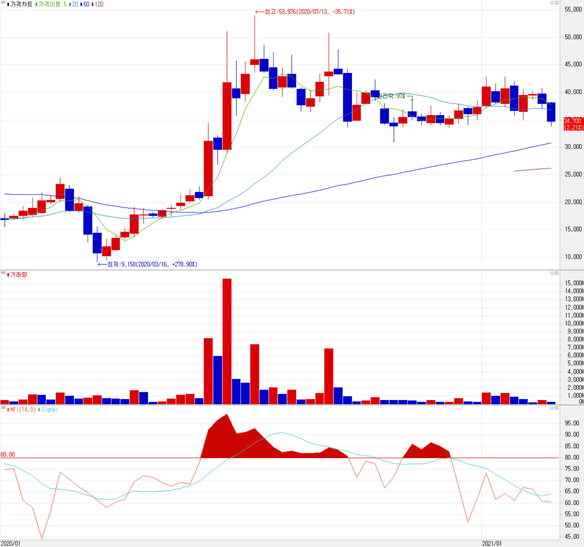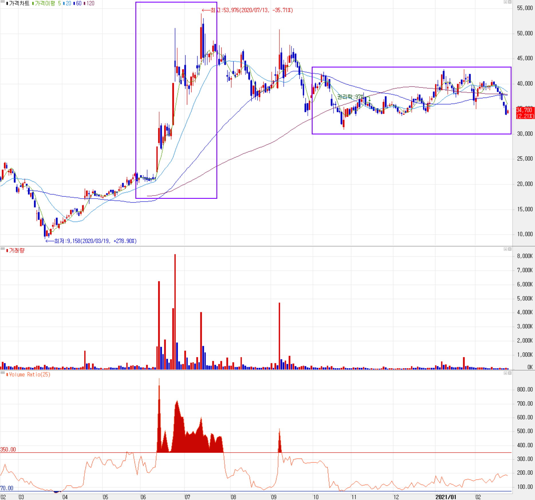 당사의 주가는 지난 6월 수소차 관련 정부 정책(그린 뉴딜 등)과 니콜라의 주가 급등 등에 따른 테마를 타고 주가가 레벨업되었으나, 시장의 수급이 변하면서 지난 10월부터는 박스권에서 횡보하는 모습입니다. 2021년 들어서는 소폭이지만 고점도 점차 낮아지는 추세이며, 수급에서는 외국인과 금융투자의 매수우위가 보이지만, 거래량이 너무 적습니다. 한동안 이제는 4분기 실적과 함께 1분기 실적 상황을 보면서 성장주로서 받았던 기대에 대한 결과를 확인하고 투자할 시기로 생각됩니다. 조정 시 1차 지지선을 31,000원으로 보고 접근하면 좋겠습니다. 4분기 실적과 2021년 개황에 따라 전고점인 42,000원 대를 넘어서지 않을까 예상합니다.