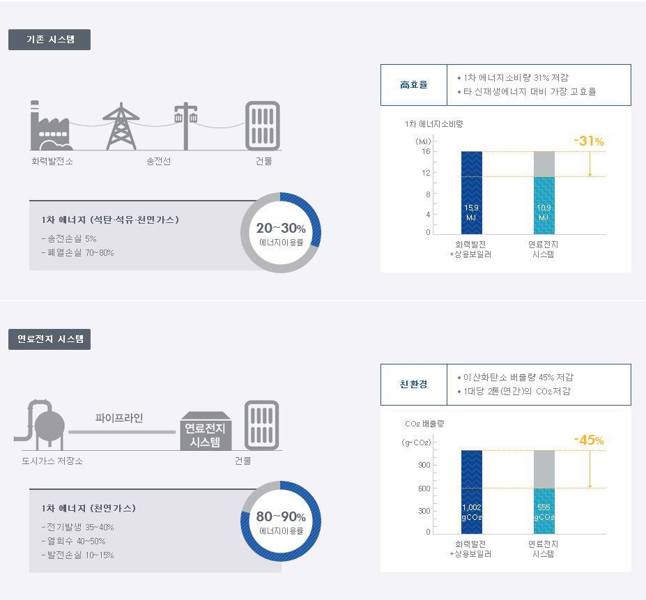 대표적 신재생에너지인 연료전지 발전 시스템은 기존의 화력발전 시스템에 대비하여 31%의 1차 에너지 감소 효과와 45%의 이산화탄소 저감 효과를 가지고 있습니다.