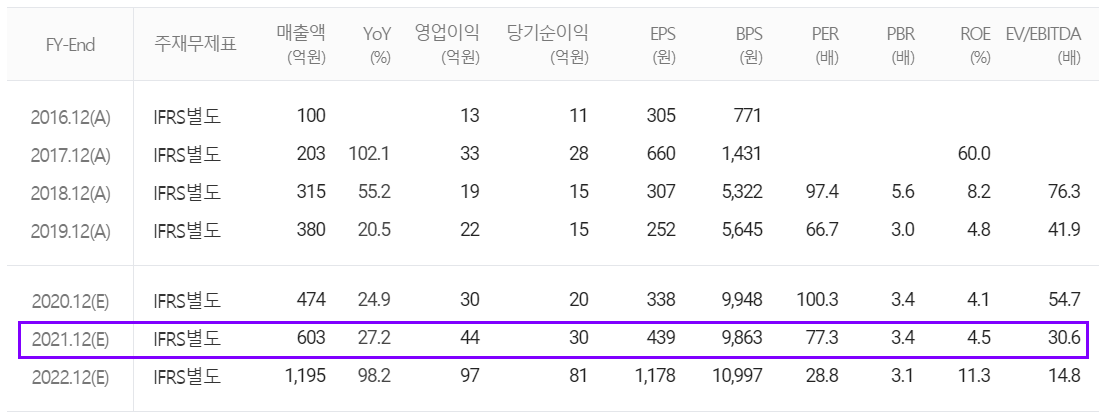 2021년의 경우 연매출 603억 원으로 2020년 대비 27.2%, 영업이익은 46.6% 성장할 것으로 추정했습니다.