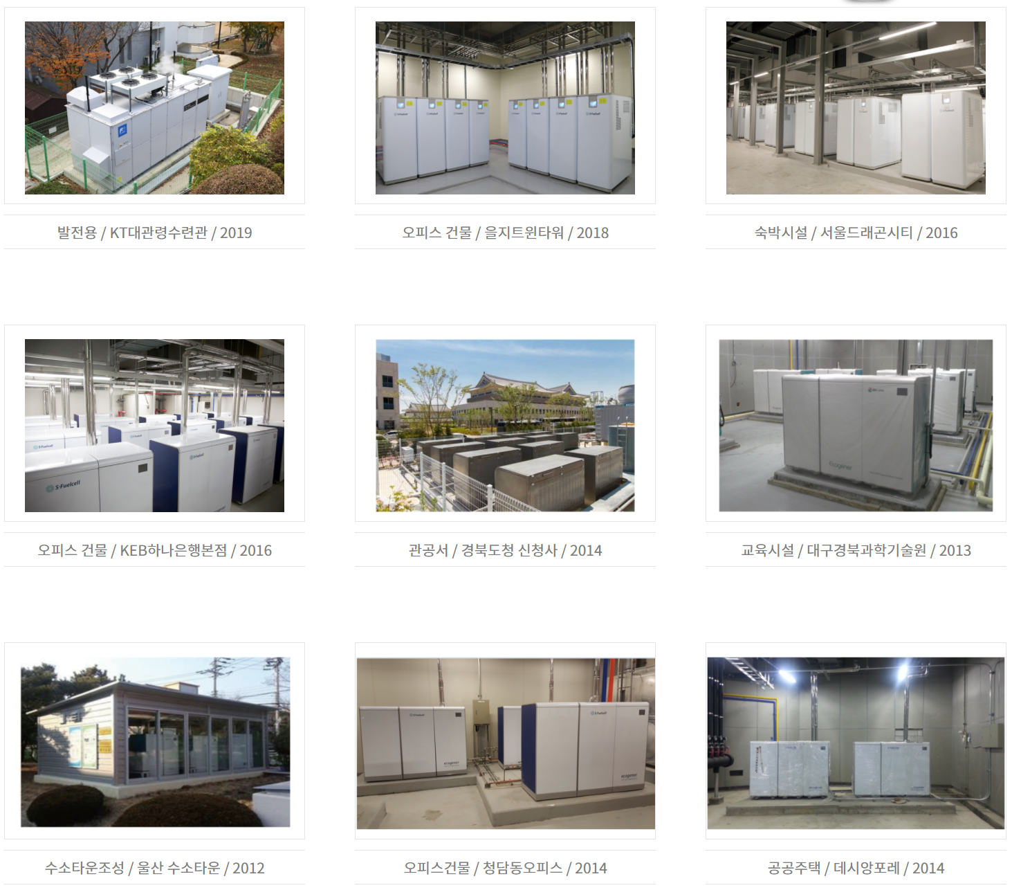 당사의 건물용 및 발전용 연료전지 시스템의 설치 사례입니다. 주요 공공 건물 및 주거용 건물과 사무용 등 다양한 분야에 설치 사례가 늘어날 것으로 전망됩니다.