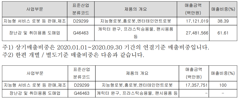 2020년 지능형 로봇 사업의 경우 2019년부터는 내수의 비중이 수출을 넘어섰습니다. 완구 사업을 영위하는 종속 기업의 비중을 볼 때 내수가 95% 이상으로 절대적인 비중을 차지하고 있습니다.