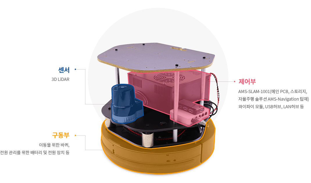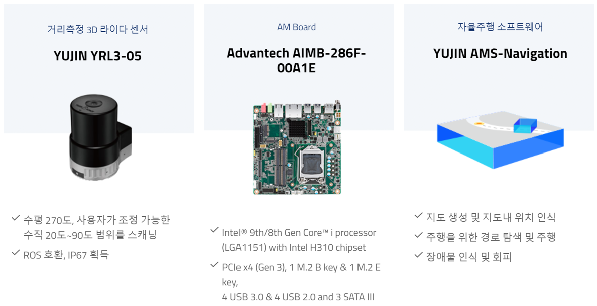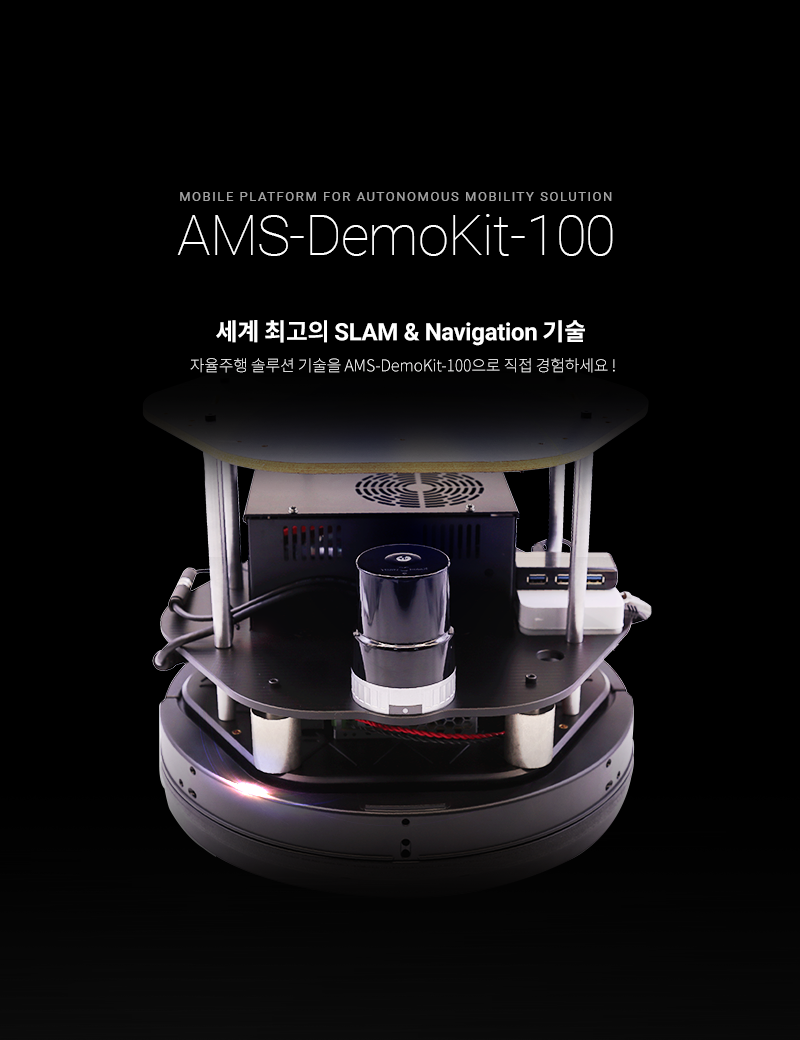 AMS-DEMOkit의 구성은 크게 3가지로 되어 있는데, 센서는 YUJIN 3D LiDAR, SLAM과 Navigation Solution은 AMS-Navigation, 구동부는 이동을 위해 당사에서 개발된 샘플 로봇입니다.