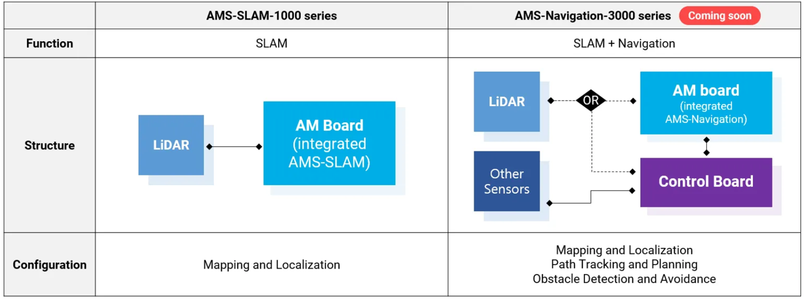 당사의 AMS-SLAM 시리즈는 SLAM과 navigation 기능을 통합한 AMS-SLAM-1000 시리즈가 있고, 맵핑 및
