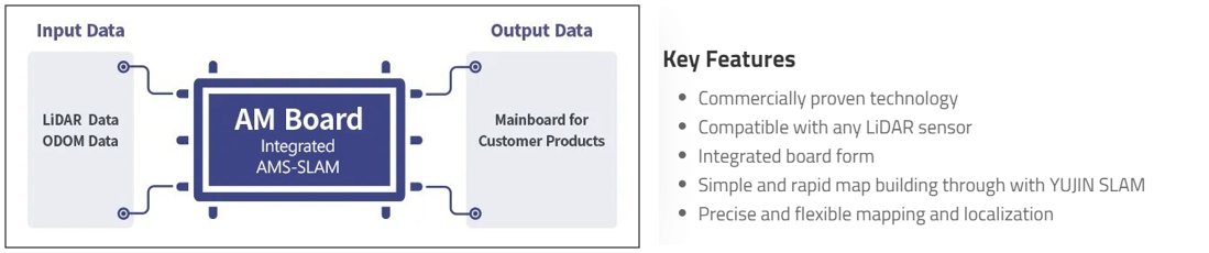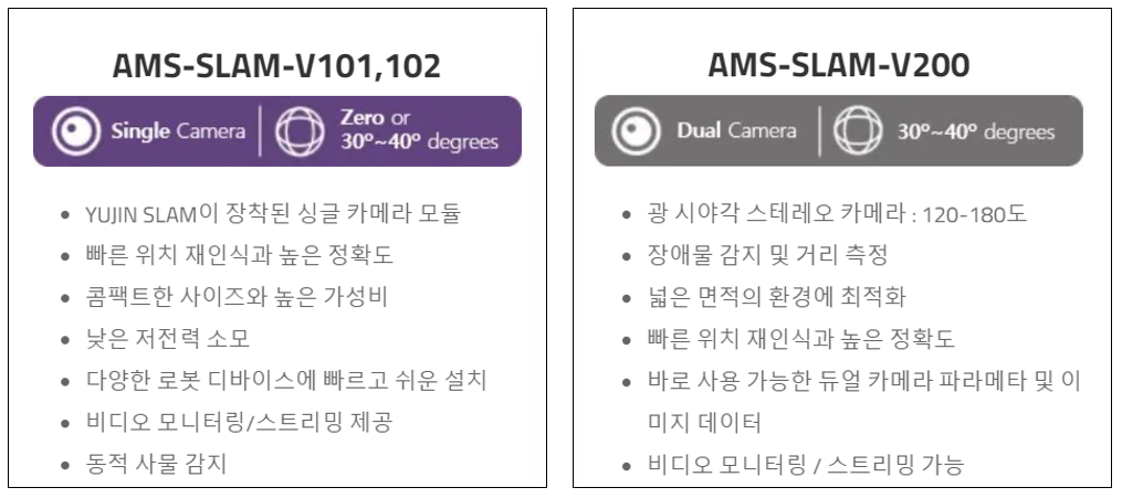 AMS-SLAM-V101, V102 및 V200은 카메라 모듈과 SLAM 소프트웨어가 통합된 보드 형태로 제공됩니다. 해당 제품은 다양한 환경에서 정확한 지도를 추출하고 동시에 로봇의 위치정보를 파악하여 제공합니다.