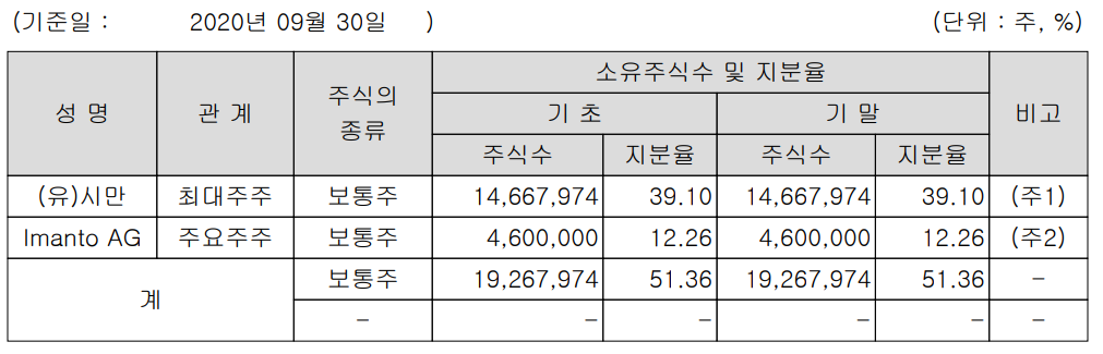 (유)시만은 2017년 12월에 당시 대표이사인 신경철로부터 현물 출자 2,934,906주를 취득하고, 제3자 배정 유상증자를 통한 11,577,097주를 인수하였고, 이후 2018년 1월에 전환사채 전환청구를 통해 155,971주를 추가 취득하면서 지분율 39.10%로 당사의 최대주주가 되었습니다.