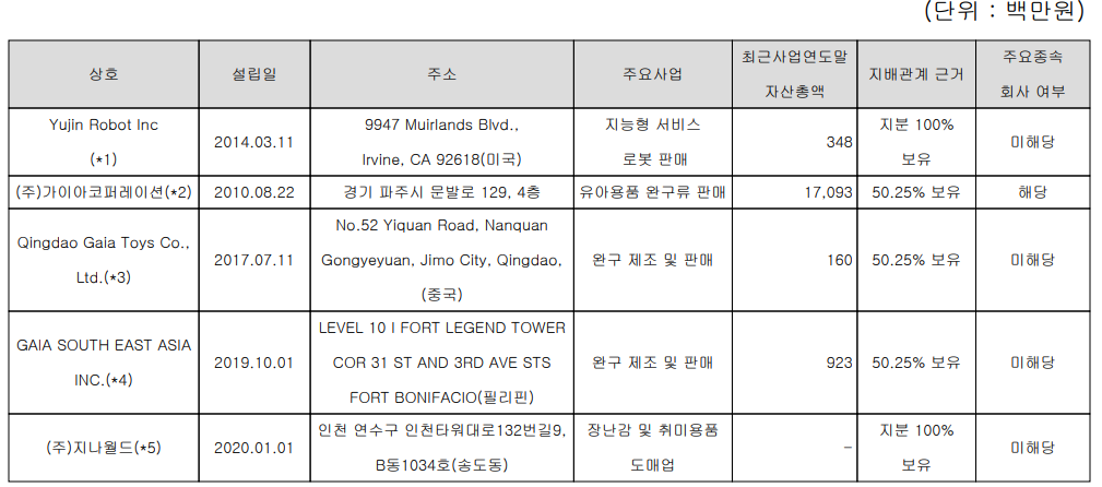 당사의 종속회사는 총 5개를 보유하고 있으며, 지능형 로봇을 판매하는 미국 현지 법인과 완구/장난감 제조 및 판매를 영위하는 4개 종속기업이 있습니다.