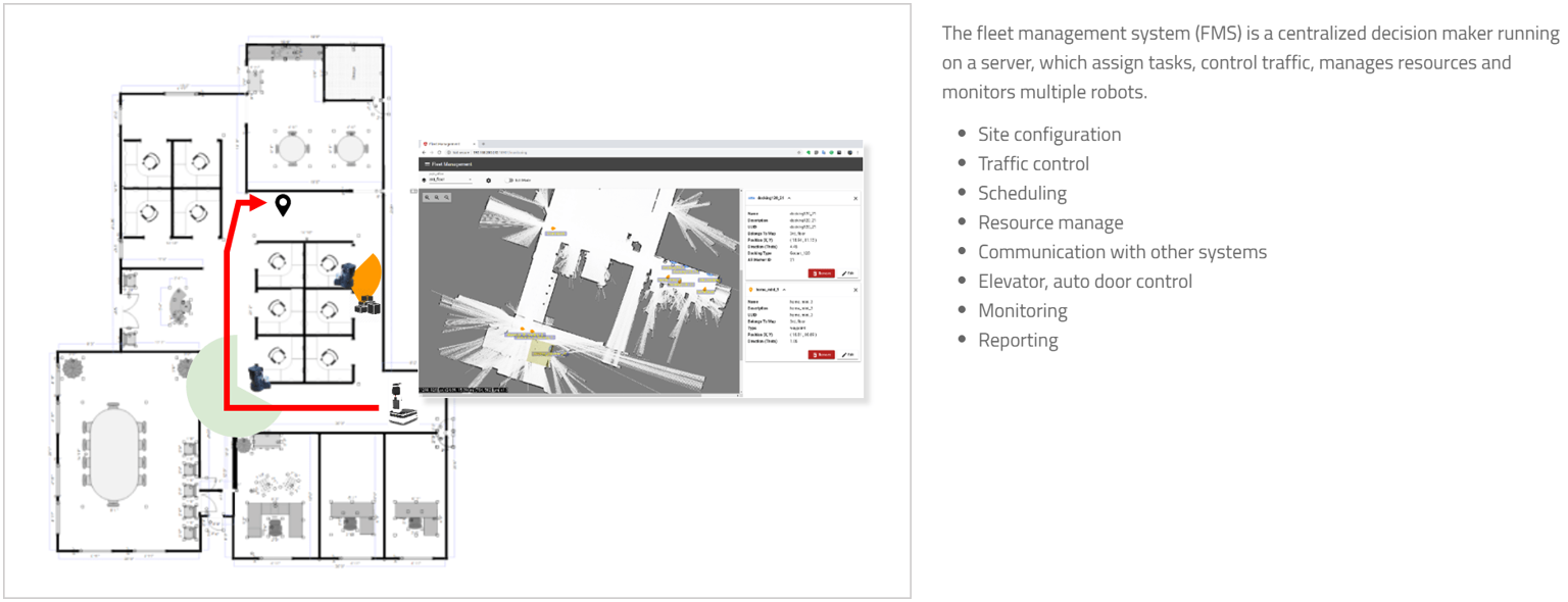 AMS-FMS(Fleet Management System)은 컴퓨터의 서버 등에서 동작하는 솔루션으로 임무 지정, 교통 제어, 자원 및 여러 로봇의 모니터링 등에 대한 관리 시스템입니다.