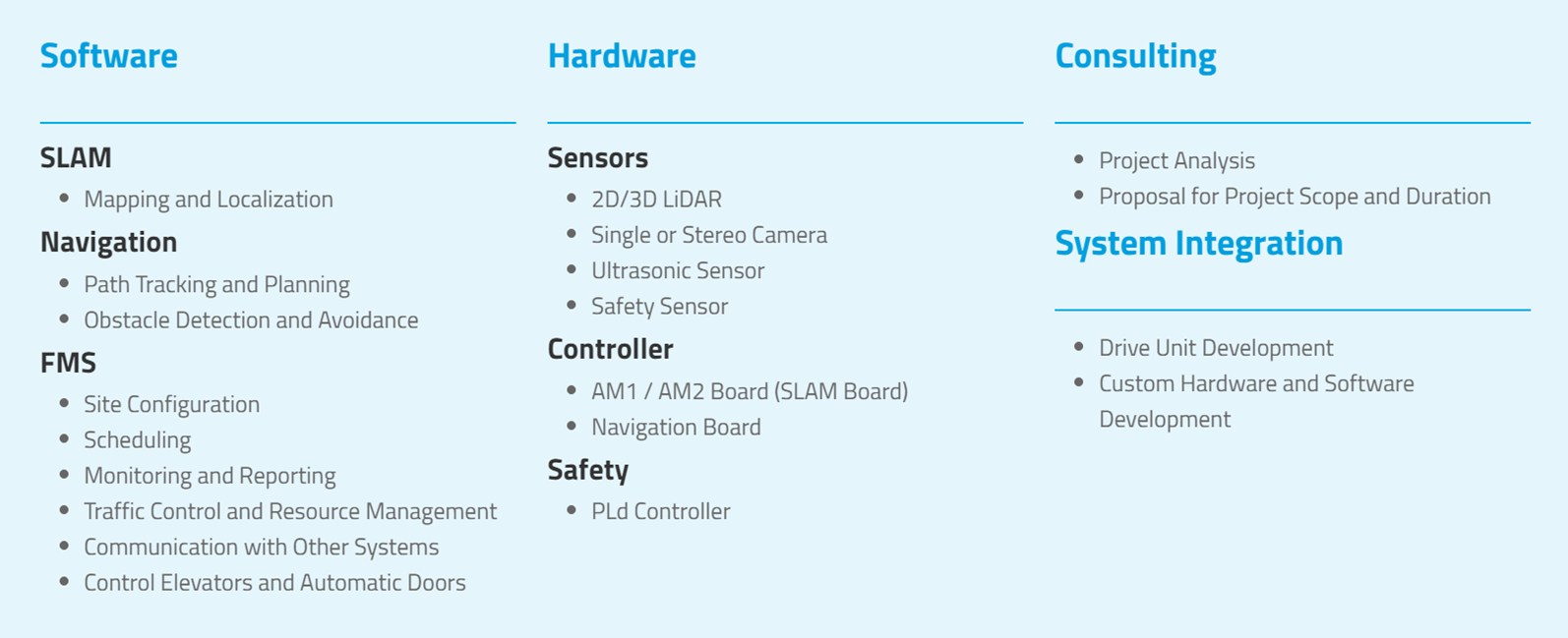 당사의 AMS 기술은 초음파 센서, 3D LiDAR, 스테레오 카메라를 융합하여 SLAM, 경로 계획, 장애물 회피 등 내비게이션 소프트웨어를 활용한 맞춤형 자율주행 솔루션을 제공합니다.