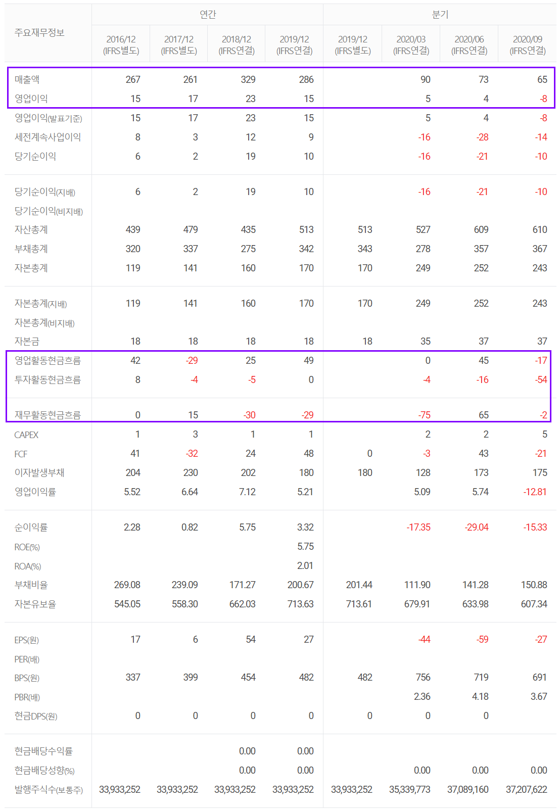 2020년 3분기말 기준 전반적으로 현금성 자산을 이용한 재무구조를 유지하고 있으며, 부채비율은 과거 4개년 보다 줄었으나, 분기 별로는 증가 추세에 있습니다.