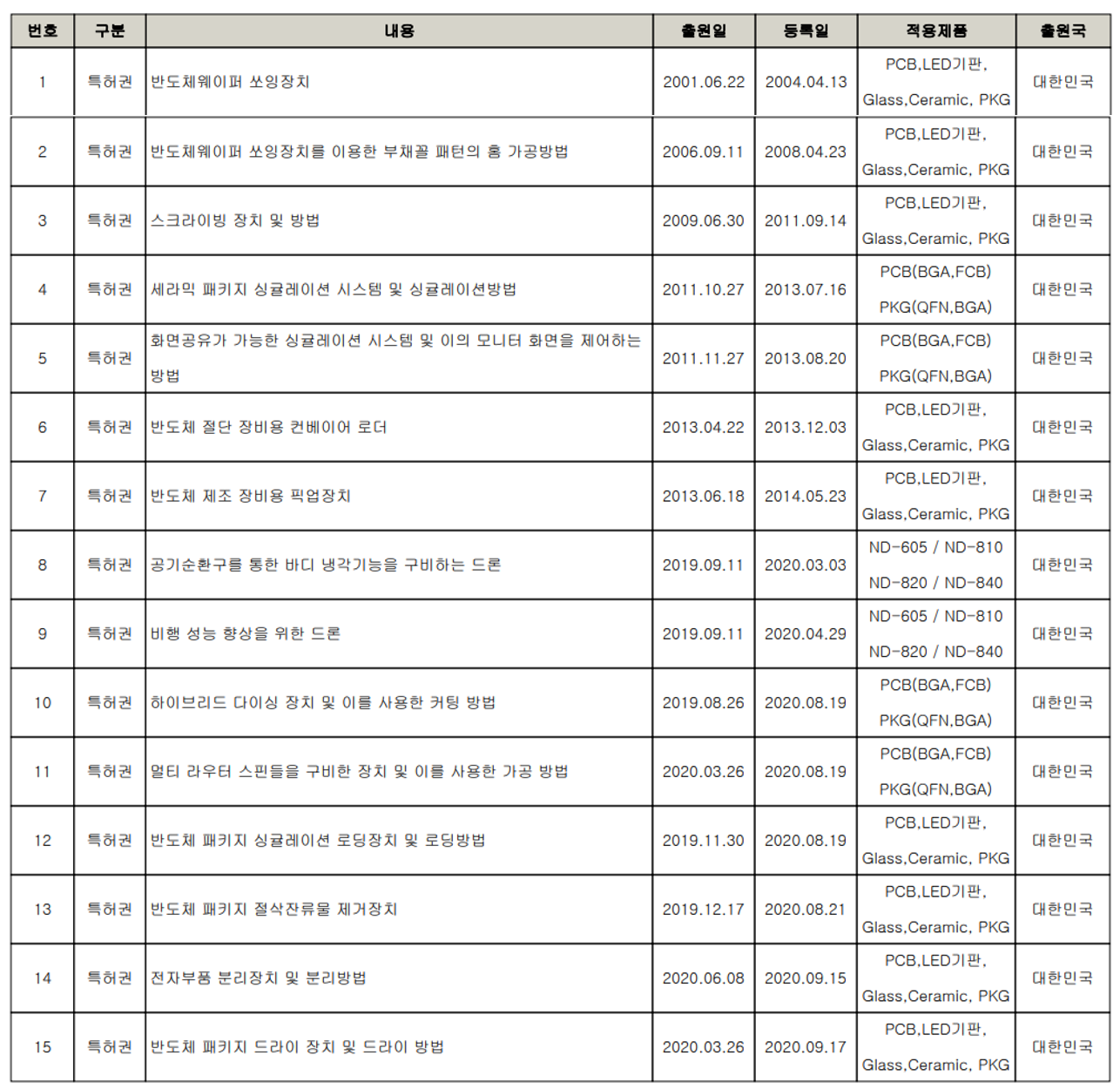 당사는 2020년 3분기 말 현재 반도체 및 디스플레이 제조공정을 위한 12건의 특허와 드론 관련 3건의 특허를 보유하고 있습니다.