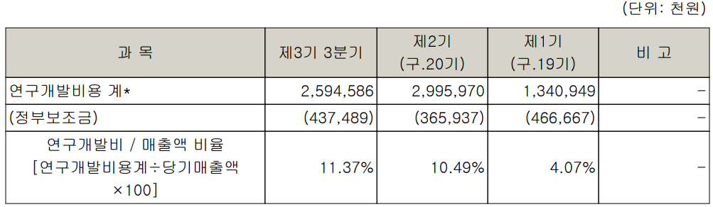 네온테크는 지난 2020년 3분기 말 기준 전체 매출액의 11.37%에 달하는 비용을 연구개발로 지출했습니다.
