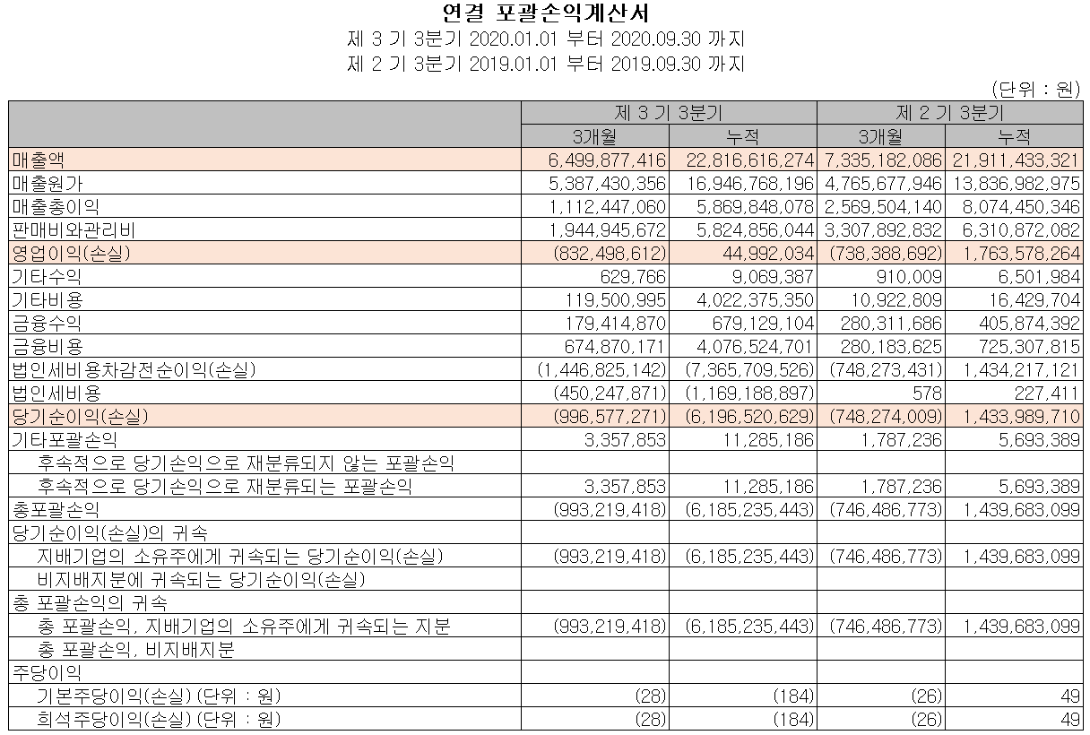 2020년 연매출은 393억 원으로 전년 동기 대비 37.4% 증가했고, 영업이익은 14억 원으로 4.6% 감소했으며 당기순이익은 적자 전환했습니다. 당사가 제시한 주요 변동 요인에는 장비 매출의 증가와 지난해 4월 인수한 신규 자회사의 연결 매출 반영으로 인해 매출액이 증가했고, 2020년 상반기 스팩합병에 따른 코스닥 상장 비용의 반영, 파생상품 평가 손실 등이 반영되었습니다.