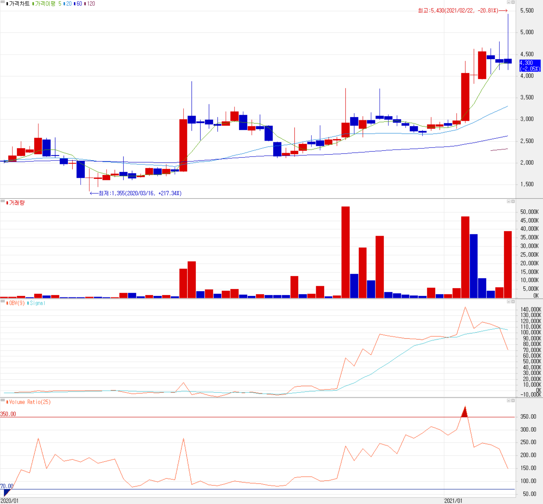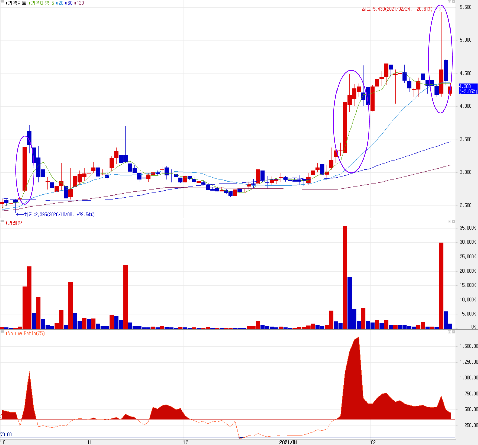 당사의 최근 일봉 차트를 보면 지난 10월 중순 당사의 주력 제품인 MLCC(적층형 세라믹 콘덴서) 장비 관련 테마와 함께 GS칼텍스 주유소 드론 배송 시연 소식, 그리고 덴탈 마스크 제조 장비 수주 소식 등에 따라 상한가를 기록하였으나, 이후 오랜 기간 횡보하다가 반도체 업황에 따른 MLCC 테마로 다시 한번 주가의 레벨업이 있었습니다. 최근에는 당사의 신성장동력인 드론 관련 사업에 대한 정부의 드론 택배 사업 허가 및 글로벌 시장의 성장 기대감으로 최고치인 5,430원까지 올랐습니다. 하지만 2월 한 달간은 시장 전반적인 조정과 변동성에 따라 주가가 등락을 반복하는 모습을 보이고 있습니다.