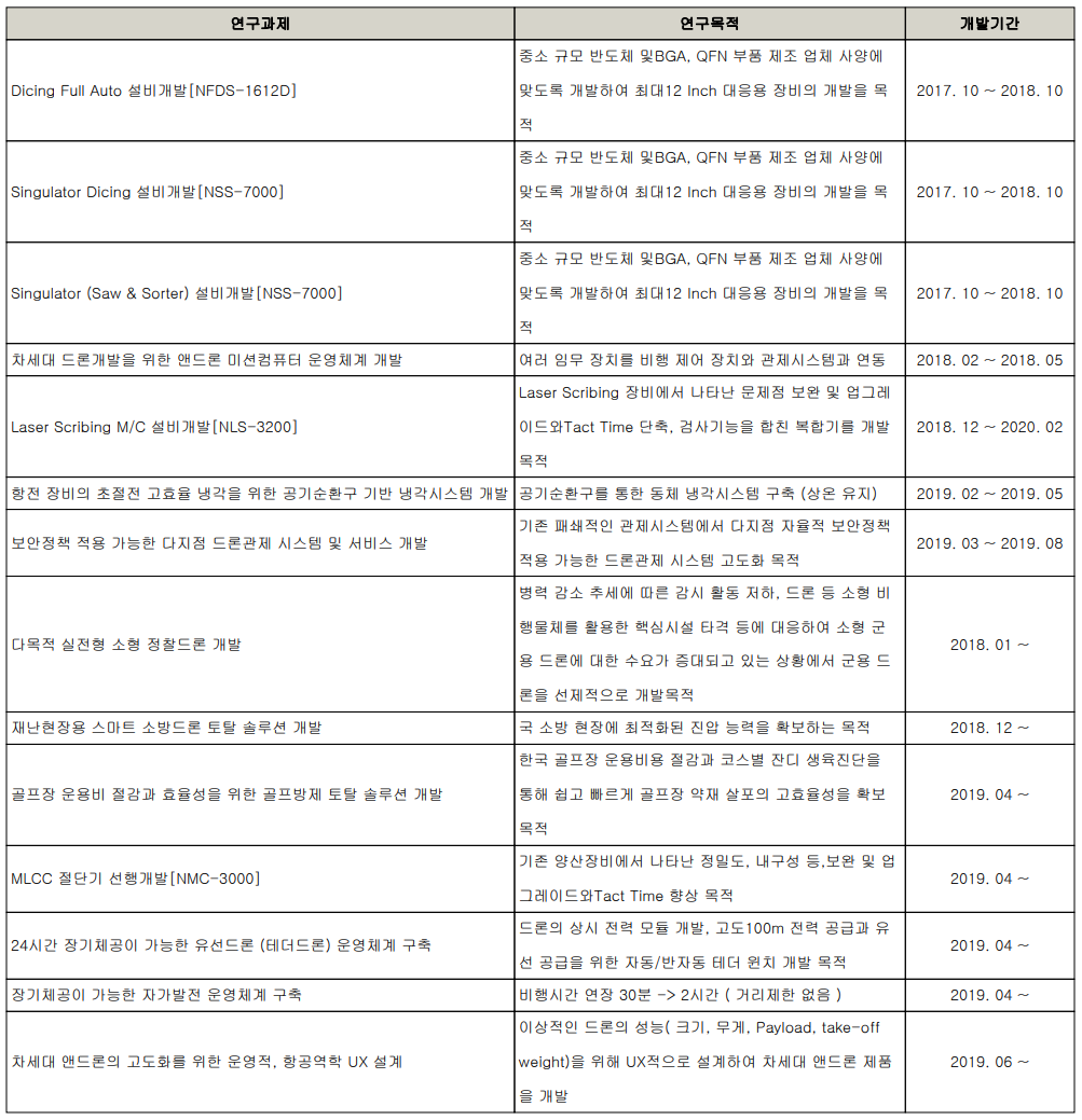 당사의 연구 개발 실적에는 반도체 및 LED 공정 관련 장비의 개발과 함께 다양한 산업용 드론 개발에 많은 시간과 비용을 투자한 것으로 보입니다.