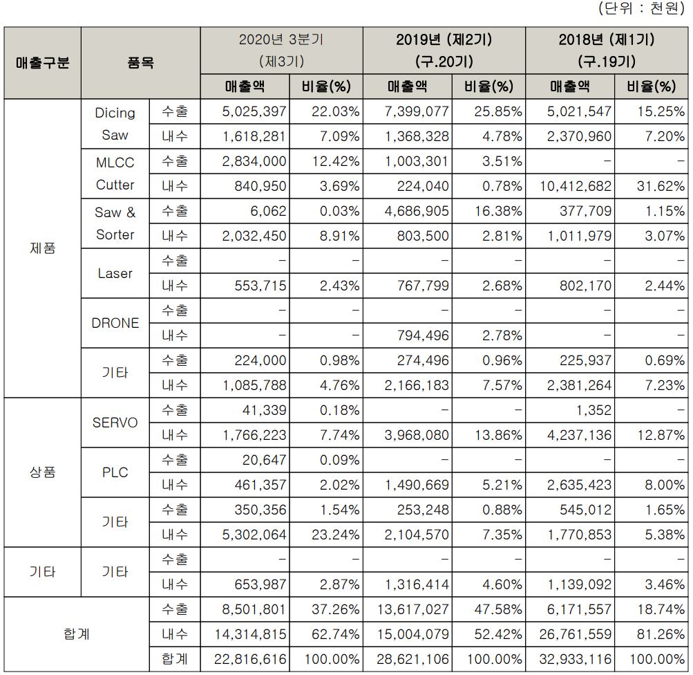 | 주요 품목 | 반도체, 디스플레이, MLCC용 절단 장비, FA, 드론 |