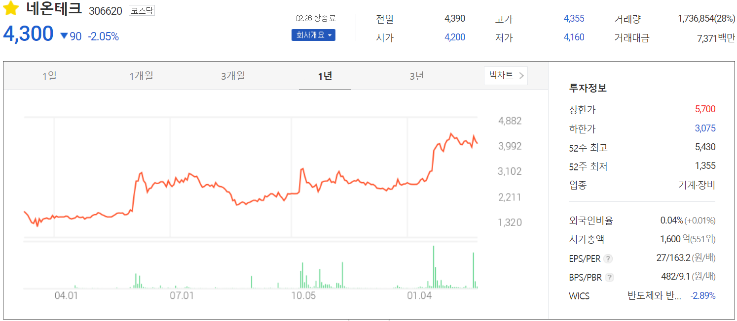 2월 26일 장종료 기준 당사의 주가는 4,300원에 거래를 마쳤습니다. 외국인 비중은 0.04%로 낮은 편이고, 시가총액 1,600억 원으로 코스닥 시총 상위 551위 종목입니다.