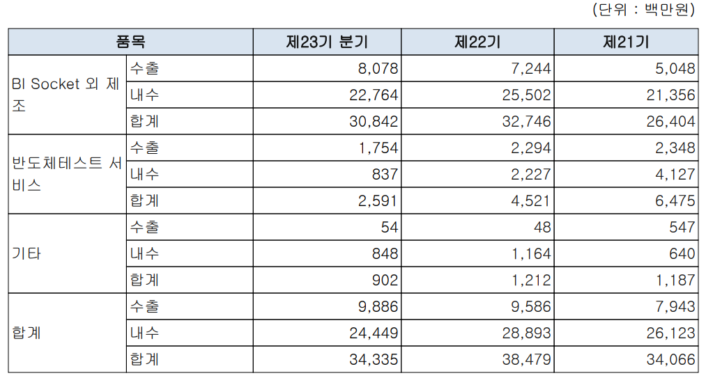 당사의 매출은 크게 반도체 검사용 소켓 부문과 테스트 용역 사업에 관련된 매출로 구분됩니다.