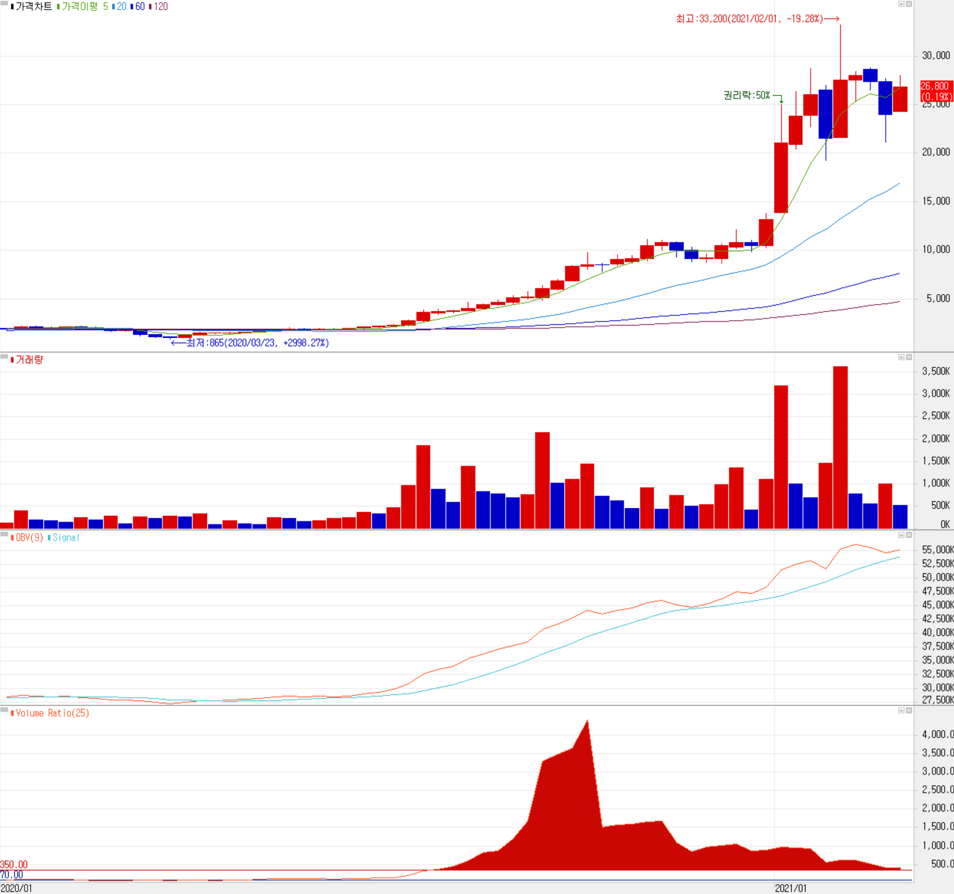 오킨스전자는 지난해 12월 반도체 경기 호황에 따라 특히 외국인의 매수세가 꾸준히 유입되다가 연말연시를 시작으로 크게 오르기 시작했습니다. 또한 1월 초에는 무상증자 권리락 효과까지 겹치면서 주가 상승을 견인했습니다. 최근 시장 전반의 변동성과 조정에 따라 당사의 주가도 영향을 받았으나, 3월 들어서면서 주 고객사인 삼성전자와 SK하이닉스의 실적 전망이 낙관적으로 나오면서 다시 상승하는 모습입니다. 최근 한 달간 수급에서는 개인의 매수 우위 속에, 기관의 거래량은 현저히 낮은 편입니다. 시장 변동성 조금 축소되는 상황 같지만, 22,000~31,000으로 폭을 넓게 보면서 접근해야 할 것 같습니다. 손절과 목표가를 분명히 정하고 진입을 해야합니다. 당사의 중장기 주가의 방향성은 제품 다변화와 신제품의 매출 가시화에 따른 이익률이 개선되는 게 중요할 것 같습니다.