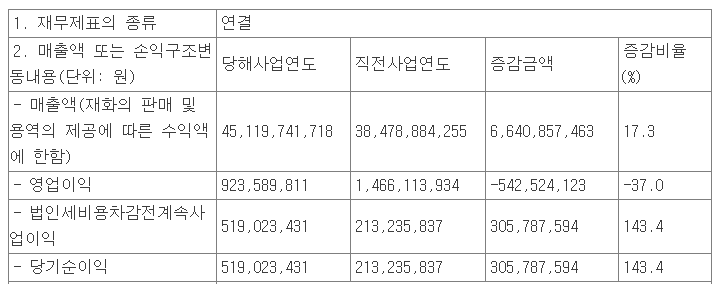 또한 업무 효율화를 위해 의왕시 고천동 부지를 매각하면서 유형자산 처분에 대한 이익(9억 8천만 원이 발생하였습니다.