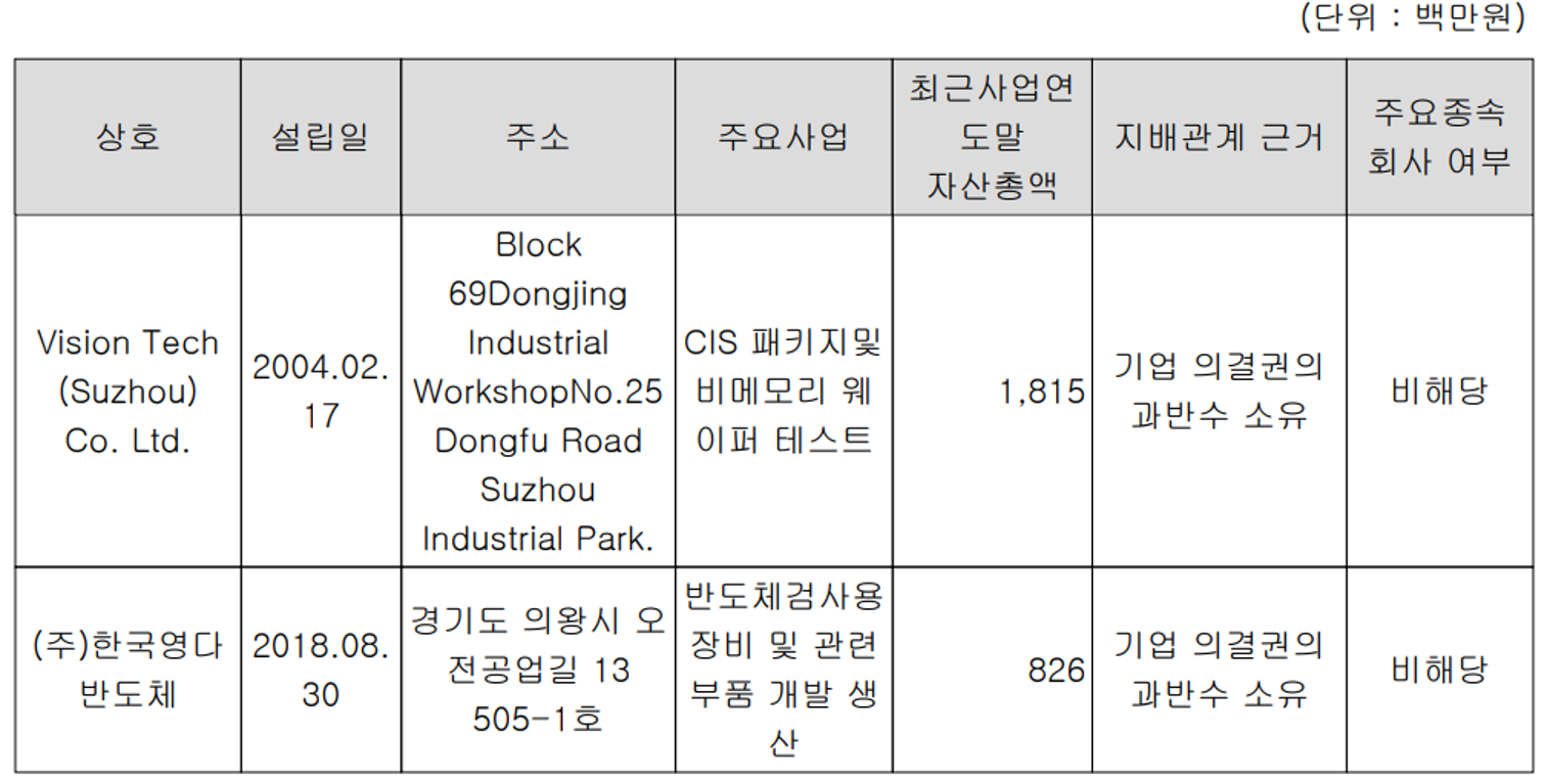 당사는 2020년 3분기 말 현재 중국 현지에서 CIS(CMOS Image Sensor) 패키지 등 비메모리 웨이퍼 테스트를 영위하는 Vision Tech와 반도체 검사용 장비 및 관련 부품의 개발 및 생산을 주로 하는 한국영다반도체 등 2개의 종속회사가 있습니다. 또한 당사는 Vision Tech 95.45%, 한국영다반도체 64.56%의 지분율을 보유하고 있습니다. 기타 글로벌 고개사의 확보 및 즉각적인 현지 대응을 위해 주요 7개 국가에 관계회사 및 협력사와 글로벌 네트워크를 구축하고 있습니다.